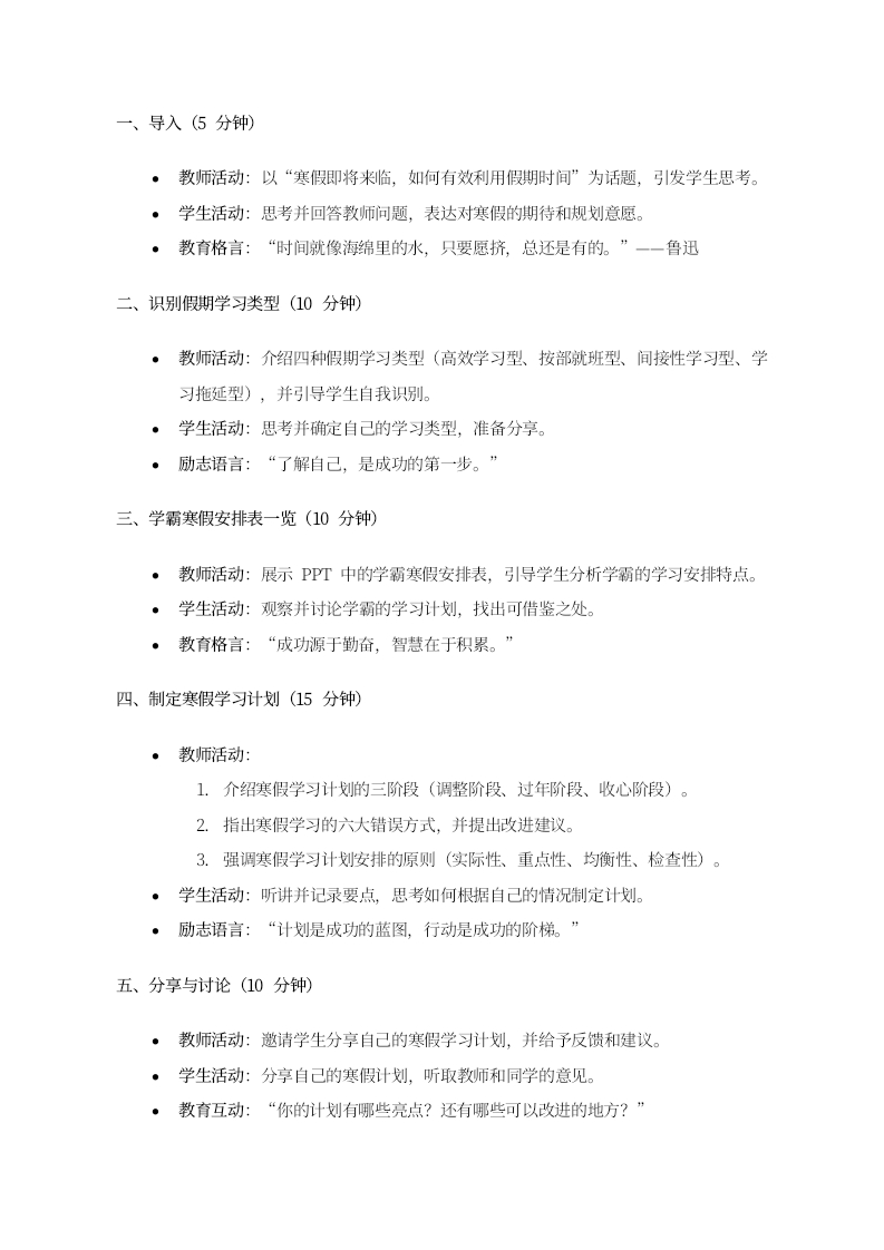 【寒假规划】主题班会《让寒假成就更好的你》教案晨晨老师13天前发布关注私信17.94KB4页03012 以下为资料部分截图预览,下载后为超高清原文件。 第1页 / 共4页 第2页 / 共4页 试读已结束,还剩2页,您可下载完整版后进行离线阅读 加入VIP,享海量教务资料,无限制免费下载所有材料 【寒假规划】主题班会《让寒假成就更好的你》教案此内容为付费资源,请付费后查看¥9.9¥15.9VIP会员免费代理(享70%分佣)免费立即购买您当前未登录!建议登陆后购买,可保存购买订单付费资源© 版权声明文章版权归作者所有,未经允许请勿转载。THE END综合资料 文本预览 课程名称:《让寒假成就更好的你》寒假学习规划指导主题班会教案教学目标:1.帮助学生识别自己的假期学习类型。2.引导学生了解并参考学霸的寒假学习安排。3.教授学生如何制定寒假学习计划,并指出常见错误方式。4.强调寒假学习计划安排的原则,鼓励学生合理规划寒假生活。教学重点:识别假期学习类型。·制定有效的寒假学习计划。·避免寒假学习的六大错误方式。教学难点:·如何根据自身情况制定个性化的学习计划。·如何在寒假中保持学习动力,避免拖延。教学方法:·讲授法:介绍假期学习类型、学霸案例、学习计划制定原则。·讨论法:学生分享自己的学习类型和寒假计划。·案例分析法:分析学霸的寒假安排表,找出可借鉴之处。教学准备:·PPT课件《让寒假成就更好的你》寒假规划。·白板和笔,用于记录学生分享和讨论要点。教学过程: 查看更多 收起部分 喜欢就支持一下吧点赞12 分享QQ空间微博QQ好友海报分享复制链接收藏