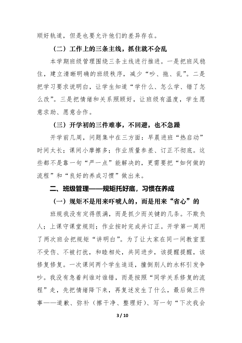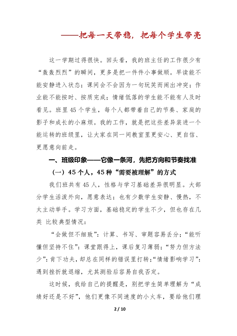 2025年秋季班主任工作总结:把每一天带稳,把每个学生带亮晨晨老师12天前发布关注私信0.36MB10页03613 以下为资料部分截图预览,下载后为超高清原文件。 第1页 / 共10页 第2页 / 共10页 第3页 / 共10页 试读已结束,还剩7页,您可下载完整版后进行离线阅读 加入VIP,享海量教务资料,无限制免费下载所有材料 2025年秋季班主任工作总结:把每一天带稳,把每个学生带亮此内容为付费资源,请付费后查看¥9.9¥15.9VIP会员免费代理(享70%分佣)免费立即购买您当前未登录!建议登陆后购买,可保存购买订单付费资源© 版权声明文章版权归作者所有,未经允许请勿转载。THE END综合资料 文本预览 2025年秋季班主任工作总结把每一天带稳,把每个学生带亮一、班级印象一一它像一条河,先把方向和节奏找准(一)45个人,45种“需要被理解”的方式(二)工作上的三条主线,抓住就不会乱(三)开学初的三件难事,不回避,也不急躁二、班级管理—规矩托好底,习惯在养成(一)规矩不是用来吓唬人的,而是用来“省心”的(二)利用好班级碎片时间,班级一稳,很多问题会自己消失(三)卫生与秩序,不靠突击检查,靠责任到人三、班级文化一“我们是谁”,班级才会更有凝聚力(一)一个共同的名字与一句共同的话(二)三面墙让进步“看得见”、让秩序“摸得着”(三)一套“可持续的仪式感”,不靠热闹,靠稳定四、育人落点—德育放进生活中,成长放进日常里(一)每周一件“看得见的好事”,坚持美好发生(二)活动开展,把班级真正带出良好气象五、学习支持一不只盯分数,更盯“学习成长”(一)抓好课堂习惯:会听、会记、会问,才是真的“学进去”(二)分层作业管理,从“交齐”走向“做对、做懂”(三)分层帮扶,让不同层次学生都有进步空间六、心理与安全一让班级有底气,学姓有依靠(一)做好安全工作,把提醒放在前面(二)做好情绪照顾,先让学生被接住,再谈改进(三)家校沟通,把班级通知变成家校合作2025年秋季班主任工作总结1/10 查看更多 收起部分 喜欢就支持一下吧点赞13 分享QQ空间微博QQ好友海报分享复制链接收藏