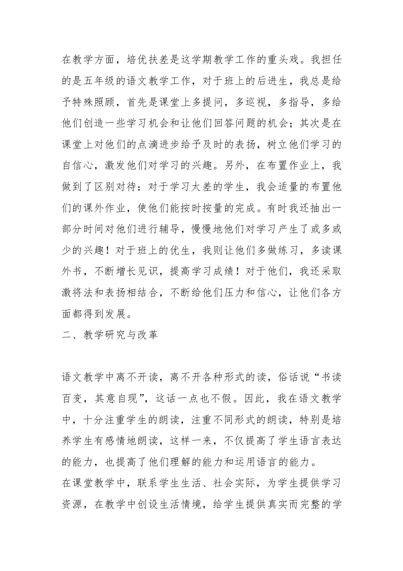 2025——2026年统编版六年级语文上册教学工作总结晨晨老师7天前发布关注私信13.84KB5页0298 以下为资料部分截图预览,下载后为超高清原文件。 第1页 / 共5页 第2页 / 共5页 试读已结束,还剩3页,您可下载完整版后进行离线阅读 加入VIP,享海量教务资料,无限制免费下载所有材料 2025——2026年统编版六年级语文上册教学工作总结此内容为付费资源,请付费后查看¥9.9¥15.9VIP会员免费代理(享70%分佣)免费立即购买您当前未登录!建议登陆后购买,可保存购买订单付费资源© 版权声明文章版权归作者所有,未经允许请勿转载。THE END综合资料 文本预览 2025一一2026年统编版六年级语文上册教学工作总结转眼间,一学期的工作已接近尾声。回想这一学期的工作有欣喜、有感动、有收获也有着困惑和遗憾,这更是一个不断学习、实践、探索、提高的过程。对此,我将对这学期的工作总结如下:一、教学任务完成情况在这学期中,在教育教学工作方面,我始终坚持党的教育方针,面向全体学生,教书育人、为人师表,确立“以学生为主体,培养学生主动发展”为中心的教学思想,重视学生的个性发展,重视激发学生的创造能力的培养,培养学生德、智、体、美、劳等方面的全面发展;重视学生的思想动态。在自身行为方面,我做到各方面都严格要求自己,力争在思想上、工作上、在同事、学生心中树立起榜样。一学期下来,我积极参加各种整治业务学习,努力提高自己的政治水平和业务水平,并服从学校的工作安排,配合学校领导和老师们做好校内外的各项工作。 查看更多 收起部分 喜欢就支持一下吧点赞8 分享QQ空间微博QQ好友海报分享复制链接收藏