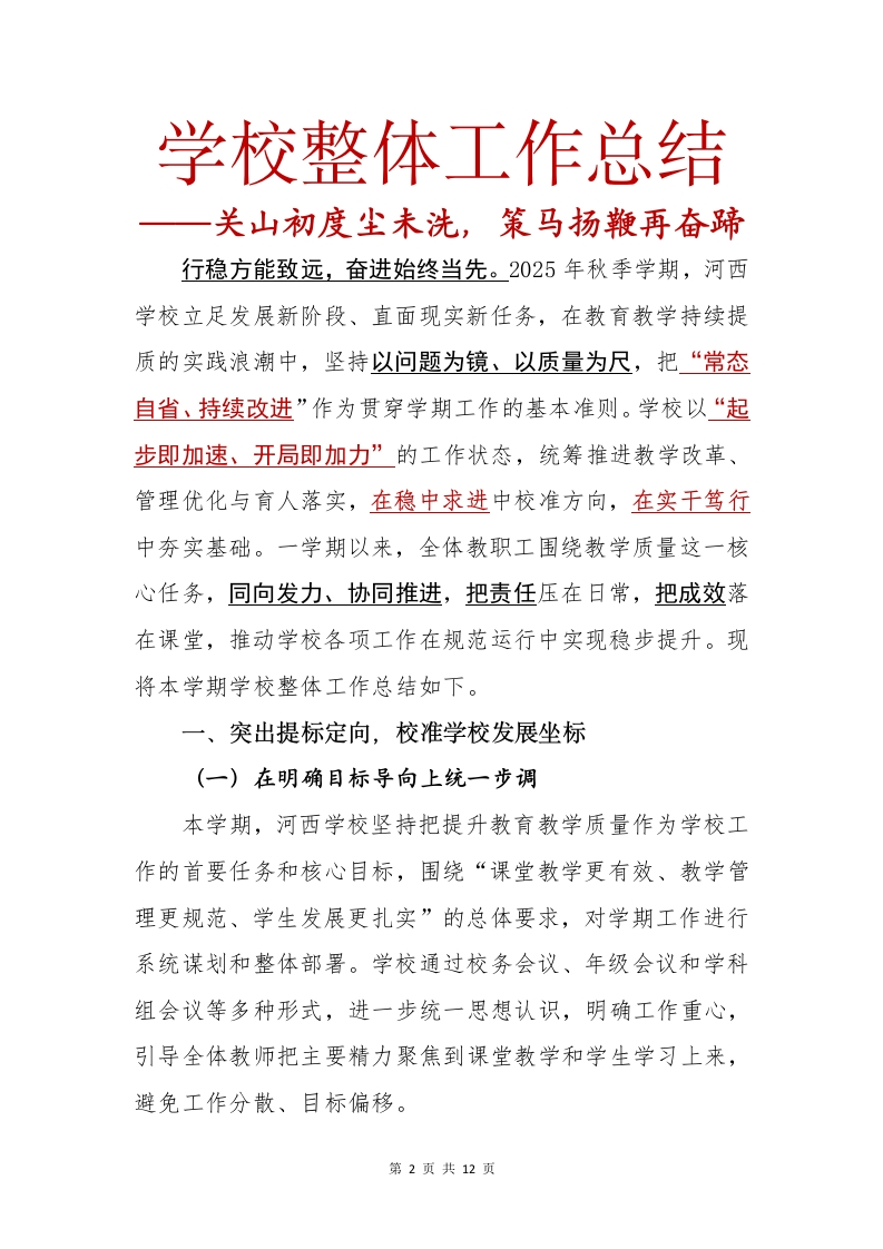 2025-2026学年第一学期学校整体工作总结——关山初度尘未洗,策马扬鞭再奋蹄晨晨老师7天前发布关注私信0.30MB12页0255 以下为资料部分截图预览,下载后为超高清原文件。 第1页 / 共12页 第2页 / 共12页 试读已结束,还剩10页,您可下载完整版后进行离线阅读 加入VIP,享海量教务资料,无限制免费下载所有材料 2025-2026学年第一学期学校整体工作总结——关山初度尘未洗,策马扬鞭再奋蹄此内容为付费资源,请付费后查看¥9.9¥15.9VIP会员免费代理(享70%分佣)免费立即购买您当前未登录!建议登陆后购买,可保存购买订单付费资源© 版权声明文章版权归作者所有,未经允许请勿转载。THE END综合资料 文本预览 2025-2026学年第一学期学校整体工作总结关山初度尘未洗,策马扬鞭再奋蹄目录一、突出提标定向,校准学校发展坐标.。.2(一)在明确目标导向上统一步调…2(二)在聚焦重点任务上精准发力.….3(三)在完善统筹机制上形成合力…二、持续强基提质,夯实教学质量根本4(一)在深耕课堂改革上求实效..4(二)在抓牢教学常规上下真功.….5(三)在强化质量分析上见变化….5三、系统优化赋能,激活教师发展引擎6(一)在健全培养体系上强支撑...6(二)在深化教研协同上提效能.7(三)在发挥骨干引领上扩影响….7四、协同推进育人,拓展学生成长路径.…8(一)在深化德育融合上增厚度.….8(二)在促进全面发展上拓空间8(三)在关注差异成长上补短板..9五、全面固本托底,提升学校运行保障.10(一)在守牢安全底线上不松劲….10(二)在优化服务保障上提质效10(三)在凝聚家校共识上强协同….112025-2026学年第一学期第1页共12页 查看更多 收起部分 喜欢就支持一下吧点赞5 分享QQ空间微博QQ好友海报分享复制链接收藏