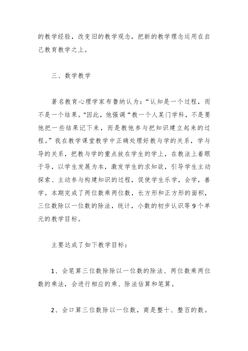 三年级数学教师工作总结晨晨老师7天前发布关注私信13.30KB5页0376 以下为资料部分截图预览,下载后为超高清原文件。 第1页 / 共5页 第2页 / 共5页 试读已结束,还剩3页,您可下载完整版后进行离线阅读 加入VIP,享海量教务资料,无限制免费下载所有材料 三年级数学教师工作总结此内容为付费资源,请付费后查看¥9.9¥15.9VIP会员免费代理(享70%分佣)免费立即购买您当前未登录!建议登陆后购买,可保存购买订单付费资源© 版权声明文章版权归作者所有,未经允许请勿转载。THE END综合资料 文本预览 三年级数学教师工作总结三年级数学是小学阶段的一个过度阶段,有着非常重要的位置,现将这期的工作总结如下,以便总结经验,找出不足,完善提高。一、师德方面以认真负责的态度上好每堂课;用满腔的爱关心学生,关心学生的学习,生活,积极做好学生的思想工作,循循善诱,既教书又育人。能主动、认真地服从和配合学校各级领导安排的工作,与同事们团结协作,相互帮助,共同完成学校交给的各项工作任务。二、学习态度新时代要求教师要不断更新充实自己的学识,要有终身学习的观念,具备渊博的知识和多方面的才能对每一位教师来说很重要。因为我们的产品会说话,会思考,他们什么问题都会提出来,而且往往“打破沙锅问到底”。没有广博的知识,就不能很好地解学生之“惑”,传为人之“道”。所以我认真参加学校组织的各种教研活动,我努力学习别人先进 查看更多 收起部分 喜欢就支持一下吧点赞6 分享QQ空间微博QQ好友海报分享复制链接收藏