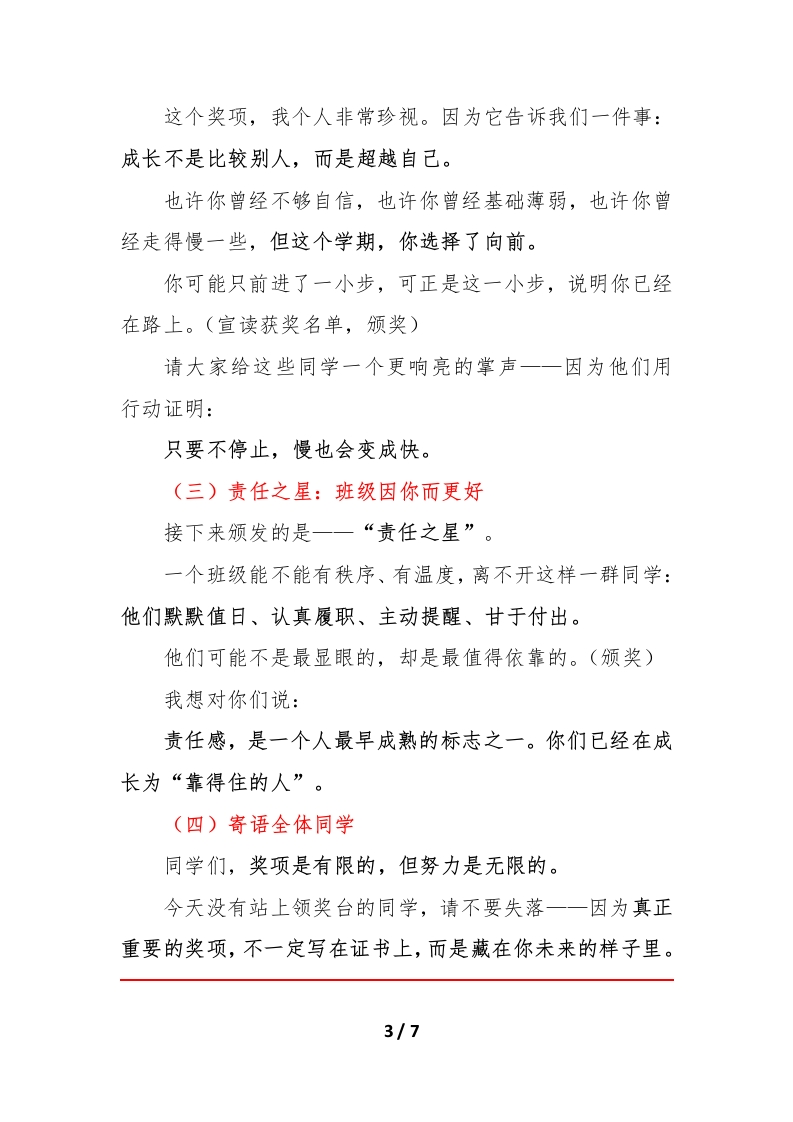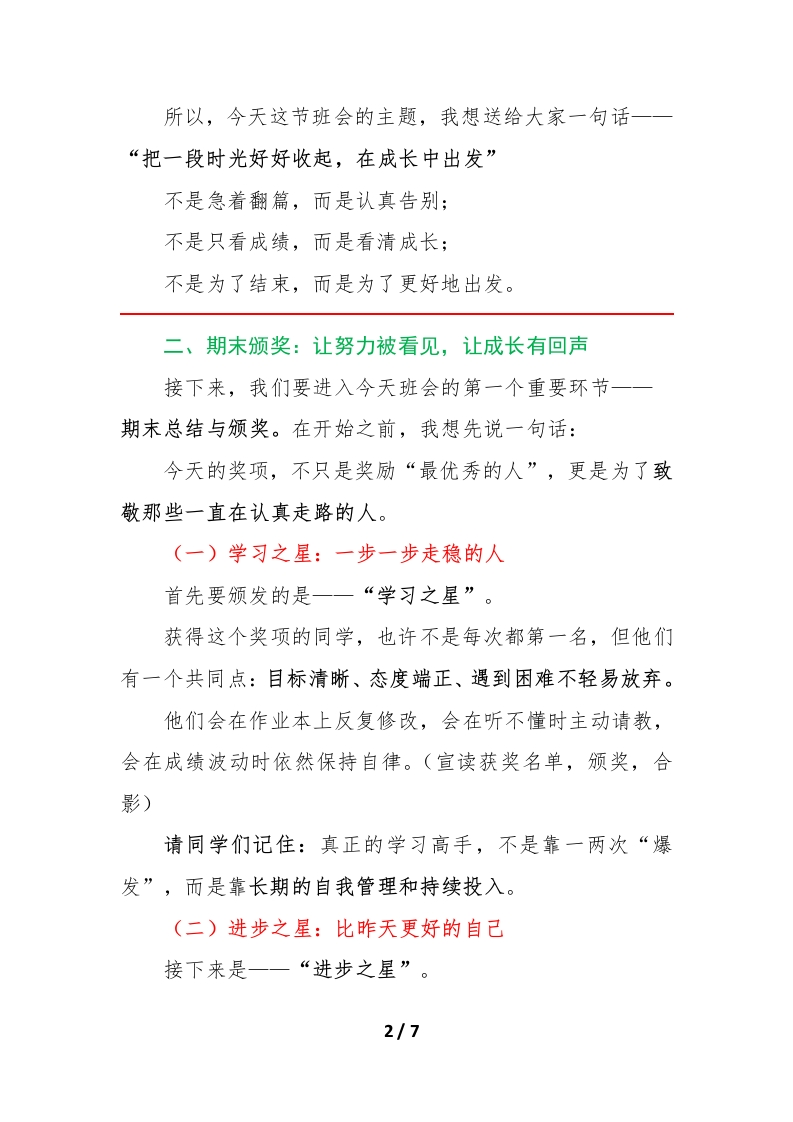 2025年期末寒假表彰主题班会:把一段时光好好收起,在成长中出发逐字稿晨晨老师6天前发布关注私信0.23MB7页04311 以下为资料部分截图预览,下载后为超高清原文件。 第1页 / 共7页 第2页 / 共7页 第3页 / 共7页 试读已结束,还剩4页,您可下载完整版后进行离线阅读 加入VIP,享海量教务资料,无限制免费下载所有材料 2025年期末寒假表彰主题班会:把一段时光好好收起,在成长中出发逐字稿此内容为付费资源,请付费后查看¥9.9¥15.9VIP会员免费代理(享70%分佣)免费立即购买您当前未登录!建议登陆后购买,可保存购买订单付费资源© 版权声明文章版权归作者所有,未经允许请勿转载。THE END综合资料 文本预览 把一段时光好好收起,在成长中出发2025年寒假主题班会PPT逐字稿一、开篇:当一个学期慢慢站到终点同学们,请大家先安静下来,把手里的东西轻轻放好,把目光交给讲台。今天这节班会,可能和我们平时的班会不太一样。因为,从这一刻开始,我们正在和2025年秋季的这一学期正式告别。如果把学习生活比作一段旅程,那么今天,就是我们在这个站点停下脚步,回头看一看来路、整理一下行囊、再为下一段出发做好准备的时刻。回想一下一一九月刚开学时,你站在教室里,是不是还有些陌生?第一次测验、第一次课堂发言、第一次被点名表扬,或者第一次因为粗心被提醒…那些瞬间,可能你已经忘了具体的时间,却一定还记得当时的心情。一个学期,看起来不长,但它足以改变一个人很多地方:有人字写得更稳了;有人敢举手表达了;有人学会坚持完成一件并不容易的事;也有人在一次次失败后,开始真正理解“努力”这两个字的重量。1/7 查看更多 收起部分 喜欢就支持一下吧点赞11 分享QQ空间微博QQ好友海报分享复制链接收藏