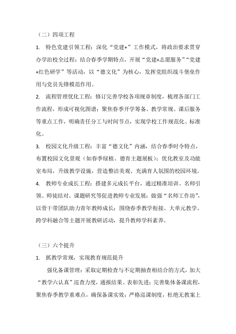 2025—2026学年春季第二学期小学学校工作计划:守正创新提质效,笃行致远育新苗晨晨老师5天前发布关注私信14.98KB6页04314 以下为资料部分截图预览,下载后为超高清原文件。 第1页 / 共6页 第2页 / 共6页 试读已结束,还剩4页,您可下载完整版后进行离线阅读 加入VIP,享海量教务资料,无限制免费下载所有材料 2025—2026学年春季第二学期小学学校工作计划:守正创新提质效,笃行致远育新苗此内容为付费资源,请付费后查看¥9.9¥15.9VIP会员免费代理(享70%分佣)免费立即购买您当前未登录!建议登陆后购买,可保存购买订单付费资源© 版权声明文章版权归作者所有,未经允许请勿转载。THE END计划汇报 文本预览 2025一2026学年春季第二学期小学学校工作计划:守正创新提质效,笃行致远育新苗一、工作目标以党的二十大及后续重要会议精神为指引,全面贯彻党的教育方针,落实立德树人根本任务,立足学校发展实际与2026年春季学期特点,围绕“一个核心”“四项工程”“六个提升”布局工作,聚焦学生核心素养培育,深化教育教学改革,筑牢安全防线,奋力推进学校高品质、高质量发展。二、工作措施(一)一个核心:筑牢校园安全防线1.织密安全防控网络:严格执行门卫值班与校园封闭式管理,加强进出人员登记核验;落实行政值班、护学岗制度,重点监管学生课间活动与上下学时段安全:成立领导班子日常巡查小组,定期排查校园周边环境、教学设施设备、消防器材等,建立安全隐患台账并限期整改。2.丰富安全宣传教育:通过校园公众号、广播、班队会、宣传栏等渠道,常态化开展春季安全专题教育,涵盖防溺水、交通安全、消防安全、传染病防控、防诈骗等内容:组织消防、防震、防踩踏等应急演练,提升师生自救自护能力。 查看更多 收起部分 喜欢就支持一下吧点赞14 分享QQ空间微博QQ好友海报分享复制链接收藏