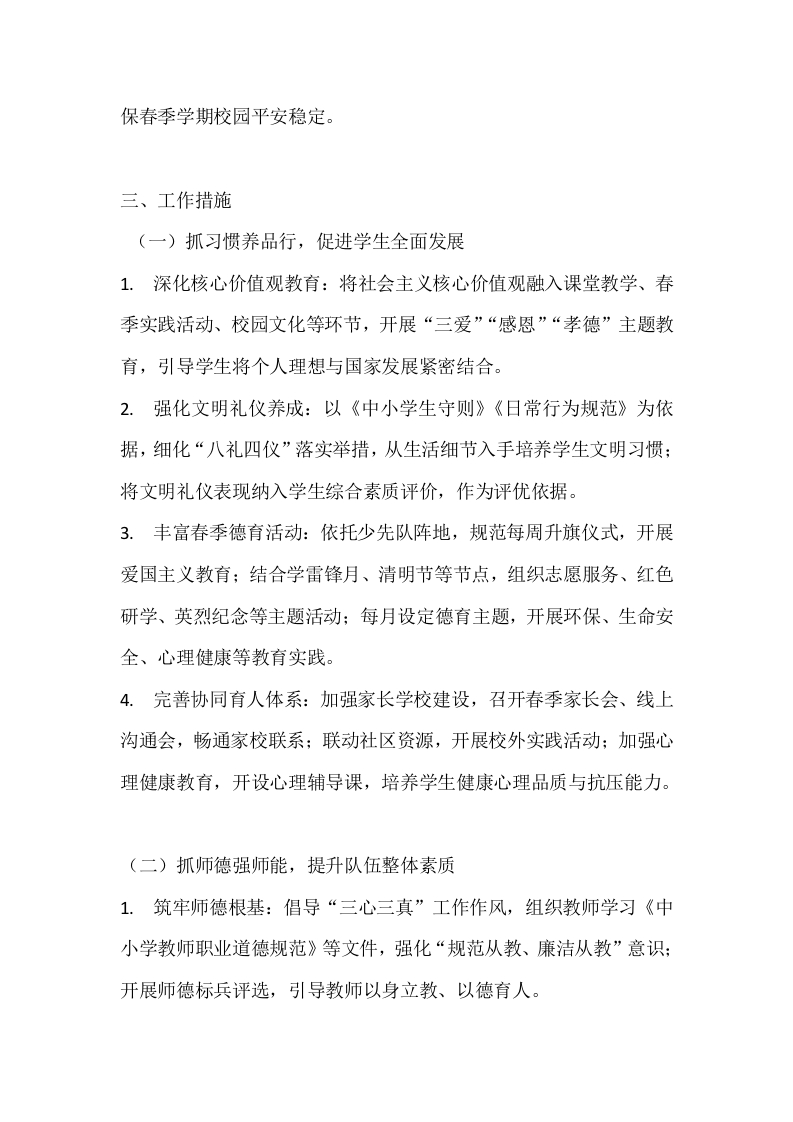 2025—2026学年春季第二学期初中学校工作计划:务实奋进育新苗,凝心聚力开新局晨晨老师5天前发布关注私信15.50KB7页04012 以下为资料部分截图预览,下载后为超高清原文件。 第1页 / 共7页 第2页 / 共7页 试读已结束,还剩5页,您可下载完整版后进行离线阅读 加入VIP,享海量教务资料,无限制免费下载所有材料 2025—2026学年春季第二学期初中学校工作计划:务实奋进育新苗,凝心聚力开新局此内容为付费资源,请付费后查看¥9.9¥15.9VIP会员免费代理(享70%分佣)免费立即购买您当前未登录!建议登陆后购买,可保存购买订单付费资源© 版权声明文章版权归作者所有,未经允许请勿转载。THE END计划汇报 文本预览 2025一2026学年春季第二学期初中学校工作计划:务实奋进育新苗,凝心聚力开新局一、指导思想以习近平新时代中国特色社会主义思想为指导,全面贯彻党的教育方针及省市教育工作会议精神,紧扣市教育局工作部署,立足2026年春季学期教育教学实际,落实立德树人根本任务,聚焦学生核心素养培育,优化队伍建设、深化教学改革、强化德育实效、筑牢安全防线,凝心聚力、务实奋进,推动学校教育工作再上新台阶。二、工作目标1.打造优质教师队伍:强化师德师风建设与专业能力提升,培育师德高尚、业务精湛、锐意进取的教师群体。2.提升教育教学质量:以课堂改革为核心,狠抓教学常规,向45分钟要效益,促进学校教学质量稳步提升。3.彰显教科研特色:深化校本教研与培训,搭建教师专业成长平台,推动教科研成果转化,助力教师专业发展4.增强德育工作实效:创新德育载体与方式,完善“学校-家庭-社会”三结合教育体系,促进学生良好品德与行为习惯养成。5.优化校园文化建设:改善办学条件,营造和谐向上、充满人文气息的校园氛围,打造师生精神家园。6.筑牢校园安全防线:健全安全管理体系,排查整治安全隐患,确 查看更多 收起部分 喜欢就支持一下吧点赞12 分享QQ空间微博QQ好友海报分享复制链接收藏