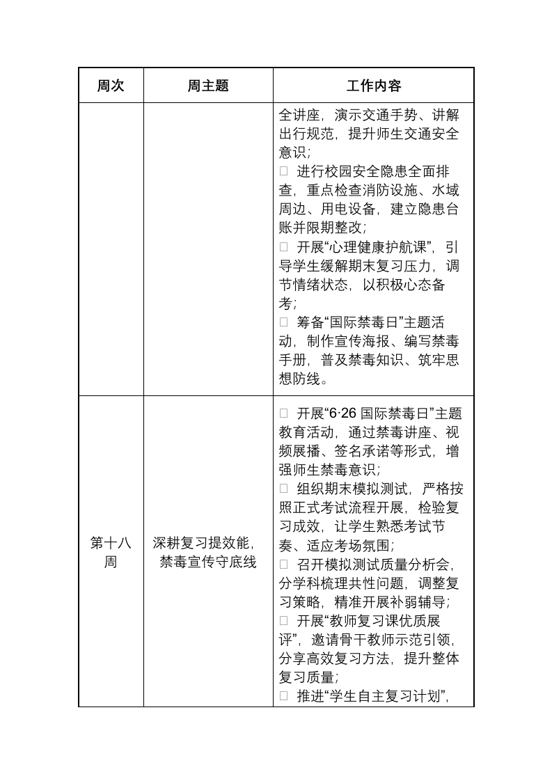 2026年6月学校重点工作安排表晨晨老师4天前发布关注私信15.36KB6页0436 以下为资料部分截图预览,下载后为超高清原文件。 第1页 / 共6页 第2页 / 共6页 试读已结束,还剩4页,您可下载完整版后进行离线阅读 加入VIP,享海量教务资料,无限制免费下载所有材料 2026年6月学校重点工作安排表此内容为付费资源,请付费后查看¥9.9¥15.9VIP会员免费代理(享70%分佣)免费立即购买您当前未登录!建议登陆后购买,可保存购买订单付费资源© 版权声明文章版权归作者所有,未经允许请勿转载。THE END计划汇报 文本预览 2026年6月学校重点工作安排表一夏木已成荫,聚力迎期末,筑梦新征程周次周主题工作内容口举办“六一国际儿童节”系列庆祝活动,开展文艺展演、趣味游园、亲子互动等环节,让学生度过欢乐节日:口表彰“优秀少先队员“三好学生“文明标兵”等先进个人与优秀班级,树立榜样、激发奋进动力口深化校园安全宣传月活动,聚焦防溺水、交通安全、食品安全、网络诈骗,通过案例警第十七童心逐梦庆六一示、知识竞赛强化教育;周安全护航筑防线口开展“防溺水专项警示教育”,签订安全责任书,发放致家长一封信,构建家校联动防护网;口推进期末复习攻坚,组织各学科开展专题突破训练,针对薄弱知识点进行集中答疑,提升复习针对性口开展“班级文化成果展”,结合学期成长主题,展示班级日志、学生作品、活动剪影,凝聚班级向心力;口邀请交警进校园开展交通安 查看更多 收起部分 喜欢就支持一下吧点赞6 分享QQ空间微博QQ好友海报分享复制链接收藏