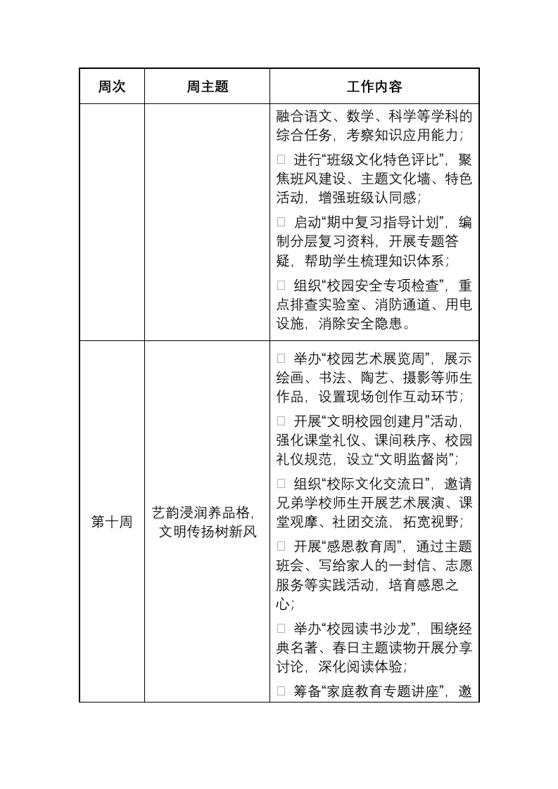 2026年4月学校重点工作安排表晨晨老师4天前发布关注私信15.53KB5页04510 以下为资料部分截图预览,下载后为超高清原文件。 第1页 / 共5页 第2页 / 共5页 试读已结束,还剩3页,您可下载完整版后进行离线阅读 加入VIP,享海量教务资料,无限制免费下载所有材料 2026年4月学校重点工作安排表此内容为付费资源,请付费后查看¥9.9¥15.9VIP会员免费代理(享70%分佣)免费立即购买您当前未登录!建议登陆后购买,可保存购买订单付费资源© 版权声明文章版权归作者所有,未经允许请勿转载。THE END计划汇报 文本预览 2026年4月学校重点工作安排表春深蓄力,智创未来,共育新苗周次周主题工作内容口筹备“校园科技节”,策划Al创意编程、科学实验展演、科技小发明评比等活动,激发学生创新思维口举办“教师教学创新交流会”,围绕大单元教学、项目式学习等案例分享,优化教学方法;口开展“春日节水护绿周”活动,组织节水宣传、校园绿植养护、环保创意实践,强化生态保护意识;第九周科技赋能启新思,口举行“校内春季体育联赛”,设实践育人促成长置跳绳、拔河、趣味接力等年级专属项目,检验体能与团队协作;口启动“社区志愿服务行动”,组织学生开展敬老帮扶、文明宣传、环境清理等公益活动,培养社会责任感;口开展“网络安全宣传周”,通过反诈讲座、案例分析、知识竞赛,提升师生网络安全防护能力口筹备“跨学科素养竞赛”,设计 查看更多 收起部分 喜欢就支持一下吧点赞10 分享QQ空间微博QQ好友海报分享复制链接收藏