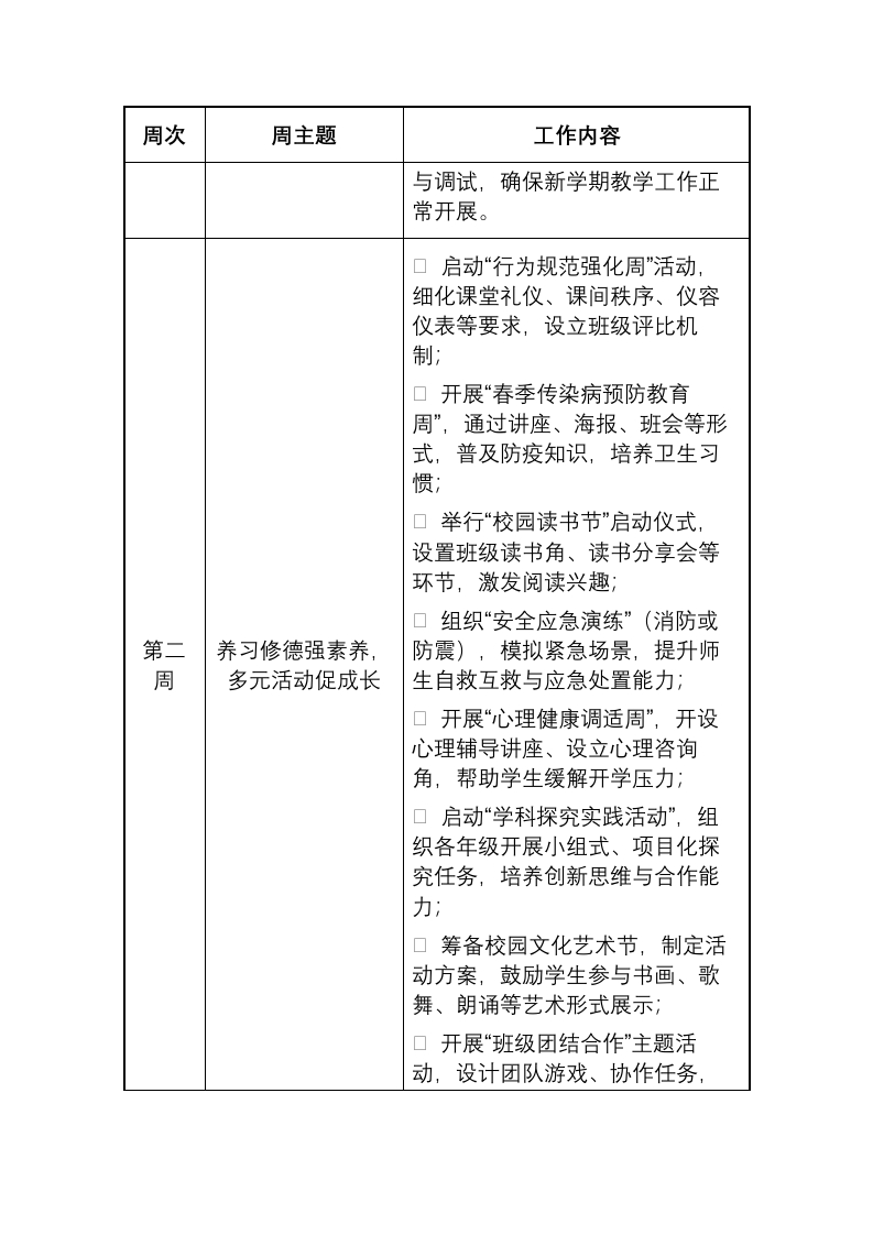 2026年2月学校重点工作安排表晨晨老师4天前发布关注私信15.28KB4页0556 以下为资料部分截图预览,下载后为超高清原文件。 第1页 / 共4页 第2页 / 共4页 试读已结束,还剩2页,您可下载完整版后进行离线阅读 加入VIP,享海量教务资料,无限制免费下载所有材料 2026年2月学校重点工作安排表此内容为付费资源,请付费后查看¥9.9¥15.9VIP会员免费代理(享70%分佣)免费立即购买您当前未登录!建议登陆后购买,可保存购买订单付费资源© 版权声明文章版权归作者所有,未经允许请勿转载。THE END计划汇报 文本预览 2026年2月学校重点工作安排表春启新程,笃行致远,共绘华章周次周主题工作内容召开全体教职工大会,部署2026年春季学期重点工作,明确教学、德育、安全等核心任务;口开展“开学第一课”系列活动,涵盖安全、德育、心理健康等主题,帮助学生快速收心归位口组织新生(转学生)校园适应性培训,包括校园环境导览、校规校纪讲解、心理调适辅导,助力融入集体;第凝心聚力启新程,口启动“班级文化焕新”活动,鼓规范起步筑根基励师生共同设计班级公约、文化墙,增强班级认同感;口开展校园环境全面清洁与绿化维护,排查安全隐患,优化教学与学习环境;口举办“教师数字化教学能力提升培训”,推广新型教学工具与方法,提升课堂教学实效;口筹备新学期家长会(分年级开展),制定沟通方案与材料,搭建家校协同育人桥梁,口完成教学设施、电教设备检修 查看更多 收起部分 喜欢就支持一下吧点赞6 分享QQ空间微博QQ好友海报分享复制链接收藏