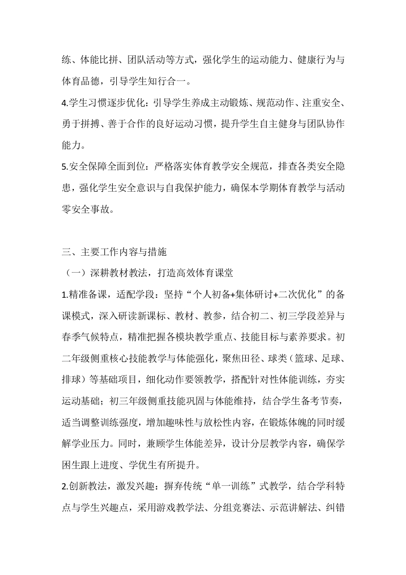 2025-2026学年春季第二学期初中体育教师工作计划:强体赋能筑根基,育德润心促成长晨晨老师22小时前发布关注私信17.53KB10页03810 以下为资料部分截图预览,下载后为超高清原文件。 第1页 / 共10页 第2页 / 共10页 试读已结束,还剩8页,您可下载完整版后进行离线阅读 加入VIP,享海量教务资料,无限制免费下载所有材料 2025-2026学年春季第二学期初中体育教师工作计划:强体赋能筑根基,育德润心促成长此内容为付费资源,请付费后查看¥9.9¥15.9VIP会员免费代理(享70%分佣)免费立即购买您当前未登录!建议登陆后购买,可保存购买订单付费资源© 版权声明文章版权归作者所有,未经允许请勿转载。THE END计划总结 文本预览 2025-2026学年春季第二学期初中体育教师工作计划:强体赋能筑根基,育德润心促成长本学期,我将秉持“健康第一、以体育人、因材施教”的教学理念,统筹推进课堂教学、体能训练、赛事活动、安全保障等各项工作,不断提升自身专业能力与教学质量,助力学生在体育锻炼中强健体魄、锤炼意志、涵养品格。一、指导思想坚持体能与技能并重、健身与育德融合、普及与提升兼顾,深化“教学评一致性”改革,引导学生主动参与体育锻炼,掌握科学健身方法,养成终身锻炼习惯,树立正确的健康观、竞争观与合作观,培养体魄强健、意志坚定的时代新人。二、工作目标1.教学质量稳步提升:立足学段学情精准施教,确保初二学生夯实体能基础、提升运动技能,初三学生维持体能水平、优化运动技巧,各学段学生健康素养与运动能力均有显著进步。2.自身能力持续精进:积极参与教研研修与教学实践,深耕教材教法与运动训练策略,提升课堂组织、动作示范、应急处置能力,形成兼具专业性与亲和力的个性化教学风格。3.素养培育落地见效:将核心素养培育融入教学全过程,通过技能训 查看更多 收起部分 喜欢就支持一下吧点赞10 分享QQ空间微博QQ好友海报分享复制链接收藏
