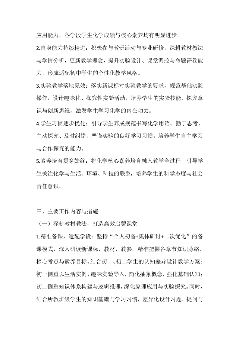 2025-2026学年春季第二学期初中化学教师工作计划:启智实验筑根基,深耕教法育素养晨晨老师22小时前发布关注私信16.94KB9页0459 以下为资料部分截图预览,下载后为超高清原文件。 第1页 / 共9页 第2页 / 共9页 试读已结束,还剩7页,您可下载完整版后进行离线阅读 加入VIP,享海量教务资料,无限制免费下载所有材料 2025-2026学年春季第二学期初中化学教师工作计划:启智实验筑根基,深耕教法育素养此内容为付费资源,请付费后查看¥9.9¥15.9VIP会员免费代理(享70%分佣)免费立即购买您当前未登录!建议登陆后购买,可保存购买订单付费资源© 版权声明文章版权归作者所有,未经允许请勿转载。THE END计划总结 文本预览 2025-2026学年春季第二学期初中化学教师工作计划:启智实验筑根基,深耕教法育素养作为初中化学教师,我将结合学校教学部署与学生学情,秉持“启蒙为先、实验为核、素养为导向”的教学理念,统筹推进备课授课、实验教学、作业辅导、素养培育等各项工作,不断提升自身专业能力与教学质量,助力学生在化学学习中感知科学魅力、锤炼思维能力、养成良好习惯。一、指导思想初中化学学科属性与初中生认知发展规律,紧扣新课标对核心素养(宏观辨识与微观探析、变化观念与平衡思想、证据推理与模型认知、科学探究与创新意识、科学态度与社会责任)的培育要求,结合春季学期教学节奏与初中化学教学特点。坚持以学生为主体、教师为主导,深化“教学评一致性”改革,注重知识传授与兴趣培养、能力提升的有机结合,强化实验教学与生活化应用,引导学生主动探究、积极思考,培养学生的科学素养与创新能力,为学生学业发展与终身成长奠定坚实基础。二、工作目标1.教学质量稳步提升:立足学段学情,精准突破教学重难点,确保初一学生夯实启蒙基础、培养学习兴趣,初二学生深化知识体系、提升 查看更多 收起部分 喜欢就支持一下吧点赞9 分享QQ空间微博QQ好友海报分享复制链接收藏