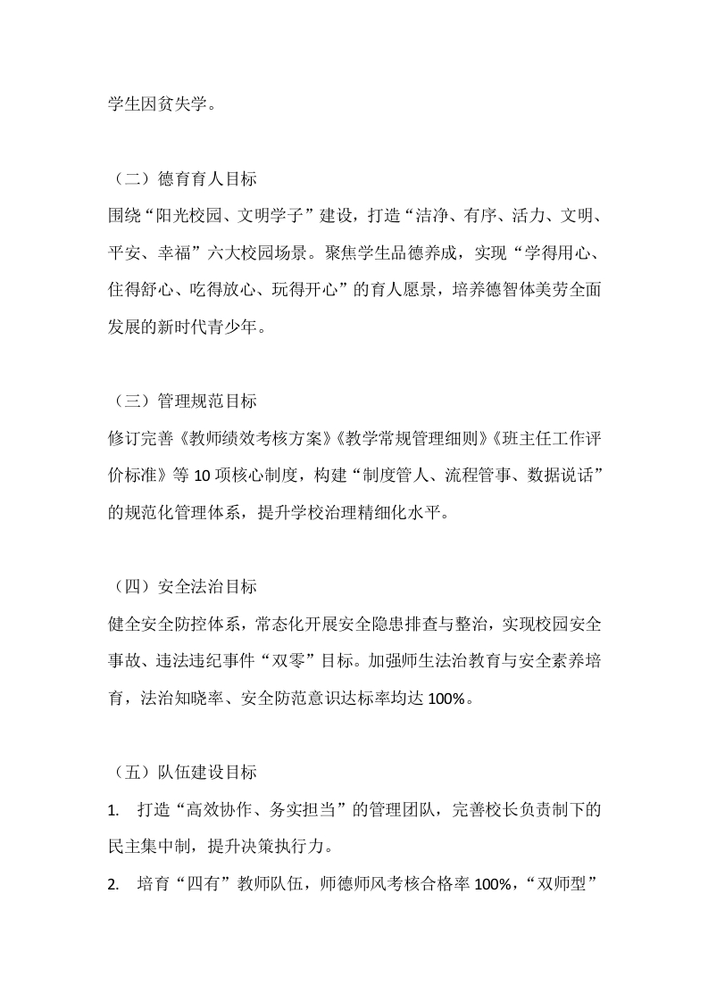2026年春季学期学校工作计划:深耕内涵提质效,守正创新启新程晨晨老师19小时前发布关注私信16.24KB8页02813 以下为资料部分截图预览,下载后为超高清原文件。 第1页 / 共8页 第2页 / 共8页 试读已结束,还剩6页,您可下载完整版后进行离线阅读 加入VIP,享海量教务资料,无限制免费下载所有材料 2026年春季学期学校工作计划:深耕内涵提质效,守正创新启新程此内容为付费资源,请付费后查看¥9.9¥15.9VIP会员免费代理(享70%分佣)免费立即购买您当前未登录!建议登陆后购买,可保存购买订单付费资源© 版权声明文章版权归作者所有,未经允许请勿转载。THE END计划总结 文本预览 2026年春季学期学校工作计划:深耕内涵提质效,守正创新启新程一、指导思想以党的教育方针为指引,全面落实上级教育主管部门年度工作部署,紧扣“立德树人”根本任务,深化教育教学改革,强化学校治理能力,聚焦学生全面发展与教师专业成长,以“优质、均衡、特色、安全”为核心导向,完善管理机制、优化育人环境、提升服务品质,推动学校内涵式发展迈上新台阶,努力办好人民满意的教育。二、核心工作目标(一)教学质量提升目标1.深化新课程改革实践,打造3-5节校级精品课例,形成具有本校特色的课堂教学模式,力争获评区级课改先进单位。2.严格落实课程方案,各年级学科成绩较上学期稳步提升,优秀率、及格率分别提高3-5个百分点,毕业班中考综合排名实现区内进位。3.规范教学常规管理,实现备课、上课、作业批改、教研等环节标准化、常态化,常规执行合格率达100%。4.完成“十四五”教师继续教育收官任务,培育市级以上骨干教师5名,教师专业发展整体水平显著提升。5.立项区级以上课题2项,完成现有课题结题工作,形成“以研促教、以教提质”的良性循环。6.扎实推进控辍保学工作,巩固率保持在99.8%以上,确保无一名 查看更多 收起部分 喜欢就支持一下吧点赞13 分享QQ空间微博QQ好友海报分享复制链接收藏