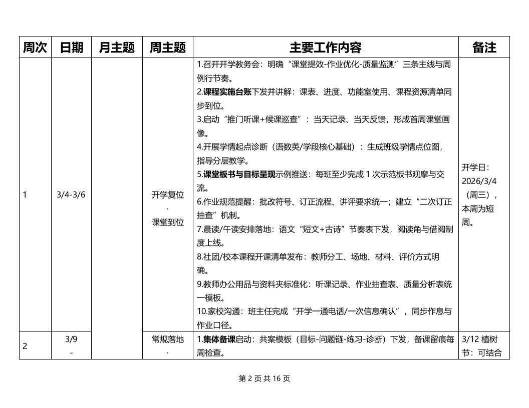 2026春季学期教导处工作安排表(横版)晨晨老师26天前发布关注私信71.54KB16页04212 以下为资料部分截图预览,下载后为超高清原文件。 第1页 / 共16页 第2页 / 共16页 试读已结束,还剩14页,您可下载完整版后进行离线阅读 加入VIP,享海量教务资料,无限制免费下载所有材料 2026春季学期教导处工作安排表(横版)此内容为付费资源,请付费后查看¥9.9¥15.9VIP会员免费代理(享70%分佣)免费立即购买您当前未登录!建议登陆后购买,可保存购买订单付费资源© 版权声明文章版权归作者所有,未经允许请勿转载。THE END教研计划 文本预览 2026年春季学期教导处工作安排表周次日期月主题周主题主要工作内容备注1.课程表与作息表一次性定稿并张贴到班级后墙(含功能室周表、代课表、值周课表)。2教材教辅与学具清点到班、签收留痕;同步发放校本读本/阅读护照。3召开教研组长与备课组长碰头会:确定本学期教研节奏、公开课序列、资料归档口径。4.教学常规清单发布(备课、上课、作业、批改、辅导、检测、资料)与检查节点。5教学设备与平台巡检:智慧黑板/绿播/网络点位逐间测试,形成“可用程三月开局准备开学前两天待修-替代”台账。开学前3/2-3/3教务集中准6学籍与编班核对:转入转出、插班信息当日闭环,班主任确认并签收。规范提质系统到位备。7组织”新课标关键点+课堂提效”微培训:每位教师提交1份“本周就能用”的改进卡。8建立“学期教务日历”:月度检查、阶段检测、家长开放课、社团展示等节点对挤。9.作业管理预案:总量周报口径、分层样例(A/B/C)、错题整理要求统一。10功能室安全与器材点验:实验、信息、劳动、体育器材逐项清点,补充与借用流程明确。第1页共16页 查看更多 收起部分 喜欢就支持一下吧点赞12 分享QQ空间微博QQ好友海报分享复制链接收藏