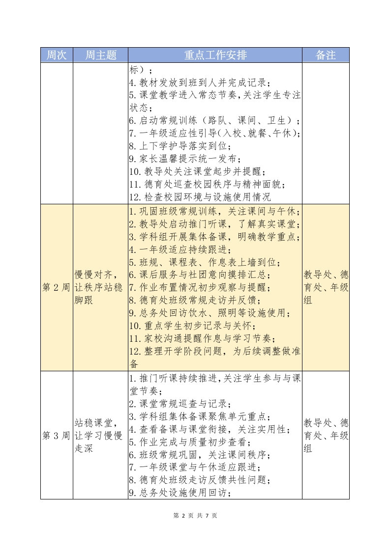 2025-2026学年第二学期学校全面工作安排表2026年3月-2026年6月晨晨老师26天前发布关注私信0.23MB7页04811 以下为资料部分截图预览,下载后为超高清原文件。 第1页 / 共7页 第2页 / 共7页 试读已结束,还剩5页,您可下载完整版后进行离线阅读 加入VIP,享海量教务资料,无限制免费下载所有材料 2025-2026学年第二学期学校全面工作安排表2026年3月-2026年6月此内容为付费资源,请付费后查看¥9.9¥15.9VIP会员免费代理(享70%分佣)免费立即购买您当前未登录!建议登陆后购买,可保存购买订单付费资源© 版权声明文章版权归作者所有,未经允许请勿转载。THE END学校活动 文本预览 2025·2026学年第二学期学校全面工作安排表(2026年3月-2026年6月)周次周主题重点工作安排备注1.召开学期工作沟通会,明确整体节奏与重点方向:2.各处室、年级组细化学期工作清单;3.教导处完成作息表、课程表、任课安排的最终校对与发布:4.德育处组织班主任集中交流,明确开学阶段管理与学生适应重点;5.总务处完成教材教辅与办公物资清点、补配与登记;6.功能室设备检查,明确管理责任人和使春未入校,用登记要求:校长室、办开学前一周先把准备做7.校园环境集中整理,优化教室与公共区公室、教导到位域面貌;处、德育8.校园重点区域安全检查,记录需完善细处、总务处节;9.发布值班安排与联络方式:10.开学典礼流程与分工确认:11.“开学第一课”主题统筹,明确年级侧重点;12.班主任提前进班检查教室布置与设备;13.校门口护导点位与人员确认:14.广播、电子屏等设备调试春来入校,1.学生返校报到,班主任完成学生情况了解;教导处、德第1周把心安在新2.举行开学典礼:育处、年级学期3.开展“开学第一课”(习惯、安全、目组、总务处第1页共7页 查看更多 收起部分 喜欢就支持一下吧点赞11 分享QQ空间微博QQ好友海报分享复制链接收藏