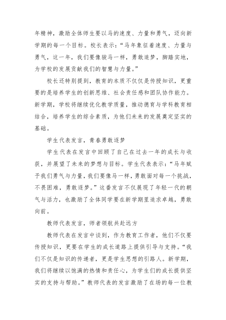 2026年春季开学典礼活动通讯稿晨晨老师23天前发布关注私信14.34KB4页03015 以下为资料部分截图预览,下载后为超高清原文件。 第1页 / 共4页 第2页 / 共4页 试读已结束,还剩2页,您可下载完整版后进行离线阅读 加入VIP,享海量教务资料,无限制免费下载所有材料 2026年春季开学典礼活动通讯稿此内容为付费资源,请付费后查看¥9.9¥15.9VIP会员免费代理(享70%分佣)免费立即购买您当前未登录!建议登陆后购买,可保存购买订单付费资源© 版权声明文章版权归作者所有,未经允许请勿转载。THE END其他资料 文本预览 2026年春季开学典礼活动通讯稿2026年3月5日,伴随着春天的脚步,2026年春季学期的开学典礼在我校盛大举行。全体师生齐聚一堂,在庄严的国歌声中拉开了新学期的序幕。此次典礼以“乘马年之风,赴飞驰之约”为主题,寓意着我校全体师生在新的学期里将继续怀揣梦想,勇敢追梦,脚踏实地,追逐属于我们的卓越与辉煌。扬帆启航,开学典礼正式启幕典礼的序幕由充满活力的《马年雷鸣之歌》拉开帷幕。歌曲的节奏激昂,歌词充满动力,象征着每一位同学都将像骏马一样,追逐梦想,奋力奔跑。这一环节不仅点燃了全体师生的热情,也为即将展开的新学期注入了力量与激情。伴随着旋律的渐弱,全体师生就座,典礼正式开始。升旗仪式,信念如山在升旗仪式环节,所有师生起立,肃穆恭敬地注视着鲜艳的五星红旗缓缓升起,雄壮的国歌奏响。这一庄严的时刻让每一位师生都感受到作为中华儿女的自豪与责任。升旗仪式结束后,校长为全体师生致辞,为我们指引了新学期的目标与方向。校长致辞,启航新征程校长在致辞中回顾了过去一年的成就与进步,并结合马 查看更多 收起部分 喜欢就支持一下吧点赞15 分享QQ空间微博QQ好友海报分享复制链接收藏