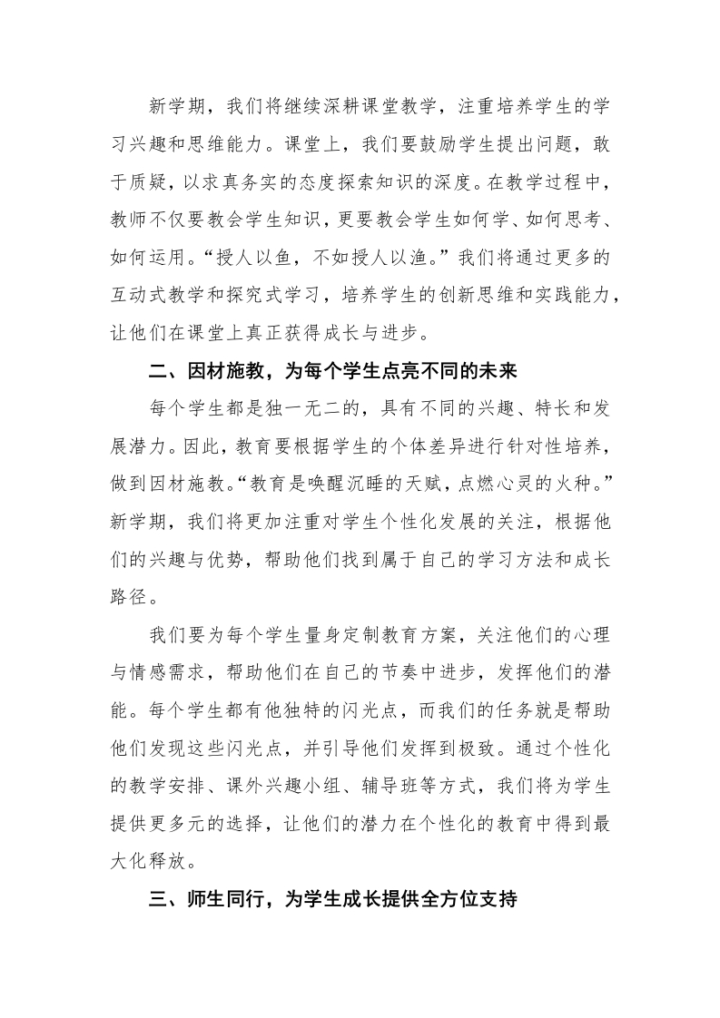 以梦为马——2026年春季开学典礼教导主任发言晨晨老师23天前发布关注私信15.08KB4页0239 以下为资料部分截图预览,下载后为超高清原文件。 第1页 / 共4页 第2页 / 共4页 试读已结束,还剩2页,您可下载完整版后进行离线阅读 加入VIP,享海量教务资料,无限制免费下载所有材料 以梦为马——2026年春季开学典礼教导主任发言此内容为付费资源,请付费后查看¥9.9¥15.9VIP会员免费代理(享70%分佣)免费立即购买您当前未登录!建议登陆后购买,可保存购买订单付费资源© 版权声明文章版权归作者所有,未经允许请勿转载。THE END其他资料 文本预览 2026年春季开学典礼教导主任发言以梦为马,扬帆启航尊敬的各位领导、亲爱的同学们:大家好!在这温暖的春日里,我们迎接崭新的学期,承载着新的希望与梦想。作为教导主任,今天能站在这里,心中充满了无尽的激动与责任感。在新的学期里,我们将继续肩负起对学生的教育使命,带领每一位学子从知识的源泉中汲取力量,助他们一臂之力,让他们在成长的道路上不断超越自我,勇敢前行。“以梦为马,扬帆启航。”这是我为新学期寄予的祝福。教育不仅是知识的传递,更是理想的启航,是每一位学子人生中的第一艘船。今天,我站在这里,怀着满怀的期待,愿我们每一位教育者都能成为这艘船的掌舵人,带领学子们驶向更加广阔的海洋。一、从课堂出发,做“知行合一”的引领者每一个孩子的成长,离不开课堂的滋养与启迪。在这片知识的沃土上,我们每一位教师都是耕耘者,种下知识的种子,等待它们在学子们的心田里茁壮成长。然而,教育不仅是知识的灌输,“教学相长”才是教育的真正意义。每一位学生的成长,离不开教师的引导和启发。“学而时习之,不亦说乎?”教育的最高境界是让学生不再依赖老师,而是能够主动吸收知识,形成自主学习的习惯。 查看更多 收起部分 喜欢就支持一下吧点赞9 分享QQ空间微博QQ好友海报分享复制链接收藏