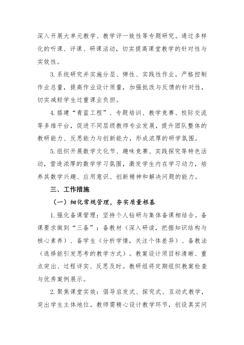 2026年春季数学教研组工作计划晨晨老师20天前发布关注私信0.31MB7页0286 以下为资料部分截图预览,下载后为超高清原文件。 第1页 / 共7页 第2页 / 共7页 试读已结束,还剩5页,您可下载完整版后进行离线阅读 加入VIP,享海量教务资料,无限制免费下载所有材料 2026年春季数学教研组工作计划此内容为付费资源,请付费后查看¥9.9¥15.9VIP会员免费代理(享70%分佣)免费立即购买您当前未登录!建议登陆后购买,可保存购买订单付费资源© 版权声明文章版权归作者所有,未经允许请勿转载。THE END计划总结 文本预览 2025-2026学年第二学期数学教研组工作计划(以梦为马逐春序骐骥驰骋向未来)主要举措一、细化常规管理,夯实质量根基二、深化教研活动,驱动课堂创新三、促进教师发展,赋能专业成长四、丰富学生活动,培育数学素养一、指导思想思深方益远,谋定而后动。2026年春季学期数学教研组将以学校整体教学工作规划为纲领,深入贯彻国家教育方针,积极践行新版《义务教育数学课程标准》理念。我们将坚持以“提升教学质量、发展核心素养”为核心,以深化课堂教学改革为主线,以规范教学常规管理为基础,以促进教师专业发展为关键。通过加强理论学习、深化校本教研、创新活动形式,致力于构建真实、有效、高效的数学课堂,全面提升学生的数学思维品质、实践应用能力与综合素养,推动教研组工作向更高水平、更高质量发展。二、工作目标1.严格执行并优化教学各环节管理,通过制度化检查与精细化反馈,规范教学行为,确保课堂教学有序、高效,为教学质量稳步提升奠定坚实基础。2.以新课标理念为引领,聚焦学生数学核心素养发展, 查看更多 收起部分 喜欢就支持一下吧点赞6 分享QQ空间微博QQ好友海报分享复制链接收藏