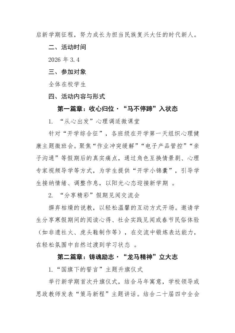 2026年春季学期“开学第一课”活动方案晨晨老师20天前发布关注私信0.25MB5页0425 以下为资料部分截图预览,下载后为超高清原文件。 第1页 / 共5页 第2页 / 共5页 试读已结束,还剩3页,您可下载完整版后进行离线阅读 加入VIP,享海量教务资料,无限制免费下载所有材料 2026年春季学期“开学第一课”活动方案此内容为付费资源,请付费后查看¥9.9¥15.9VIP会员免费代理(享70%分佣)免费立即购买您当前未登录!建议登陆后购买,可保存购买订单付费资源© 版权声明文章版权归作者所有,未经允许请勿转载。THE END计划总结 文本预览 2026年春季学期“开学第一课”活动方案2026年是农历丙午马年,春季学期承载着新的希望与征程。为引导学生尽快从寒假模式切换至校园模式,以龙马精神迎接新学期,本次活动以“策马扬鞭启新程,奋楫笃行向未来”为主题。结合春季开学学生易出现的焦虑情绪、作息紊乱以及安全防范意识淡薄等问题,通过多形式、分层次的教育活动,帮助学生调适心理、明确目标、筑牢安全防线,落实立德树人根本任务。一、指导思想以习近平新时代中国特色社会主义思想为指导,深入学习贯彻党的二十大及二十届四中全会精神,全面贯彻党的教育方针,落实立德树人根本任务。依据《中小学德育工作指南》及2026年全国教育工作会议关于“强化学生心理健康疏导与安全教育”“推进大中小学思政教育一体化建设”的相关要求,结合农历马年“龙马精神、奔腾向前”的文化寓意,立足新学期开学节点学生身心调适的实际需求。坚持“健康第一、生命至上”理念,将理想信念铸魂与心理健康教育相结合,将收心归位引导与行为习惯养成相结合,将安全法治教育与传统文化浸润相结合。通过形式多样、内涵丰富的教育活动,帮助学生迅速调整状态、树立新学期奋斗目标,筑牢校园安全防线,培育学生积极乐观、奋发向上的心理品质,引导全体学生以“策马扬鞭”的昂扬姿态开 查看更多 收起部分 喜欢就支持一下吧点赞5 分享QQ空间微博QQ好友海报分享复制链接收藏