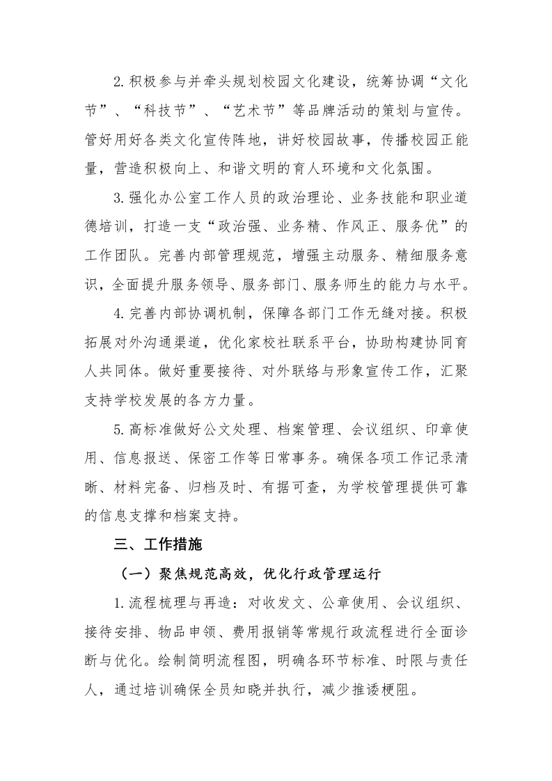 2026年春季学校办公室工作计划晨晨老师20天前发布关注私信0.32MB7页0239 以下为资料部分截图预览,下载后为超高清原文件。 第1页 / 共7页 第2页 / 共7页 试读已结束,还剩5页,您可下载完整版后进行离线阅读 加入VIP,享海量教务资料,无限制免费下载所有材料 2026年春季学校办公室工作计划此内容为付费资源,请付费后查看¥9.9¥15.9VIP会员免费代理(享70%分佣)免费立即购买您当前未登录!建议登陆后购买,可保存购买订单付费资源© 版权声明文章版权归作者所有,未经允许请勿转载。THE END计划总结 文本预览 2025-2026学年第二学期学校办公室工作计划(初心如磐践使命骐骥驰骋启新程)主要举措一、聚焦规范高效,优化行政管理运行二、聚焦文化引领,助推校园氛围营造三、聚焦能力提升,加强办公自身建设四、聚焦统筹协调,凝聚内外发展合力五、聚焦基础保障,确保日常工作规范一、指导思想再踏层峰辟新天,更扬云帆立潮头。新学期,学校办公室将紧密围绕学校整体工作部署,以服务教育教学工作为中心,秉持“服务至上、规范高效、统筹协调、保障有力”的工作理念。以优化管理流程为基础,以深化文化建设为滋养,以加强队伍建设为支撑,以推进协同育人为延伸,全面提升办公室工作的规范化、精细化、科学化水平,为学校各项事业的高质量、内涵式发展提供坚实有力的行政支持与服务保障。二、工作目标1.系统梳理、优化再造办公室核心业务工作流程,明确权责,精简环节,推动行政运转更加规范、顺畅、高效。利用信息化手段提升事务处理速度,确保学校决策和工作部署得到及时、准确的传达与落实。 查看更多 收起部分 喜欢就支持一下吧点赞9 分享QQ空间微博QQ好友海报分享复制链接收藏
