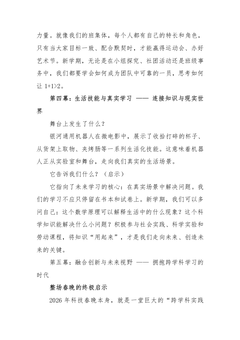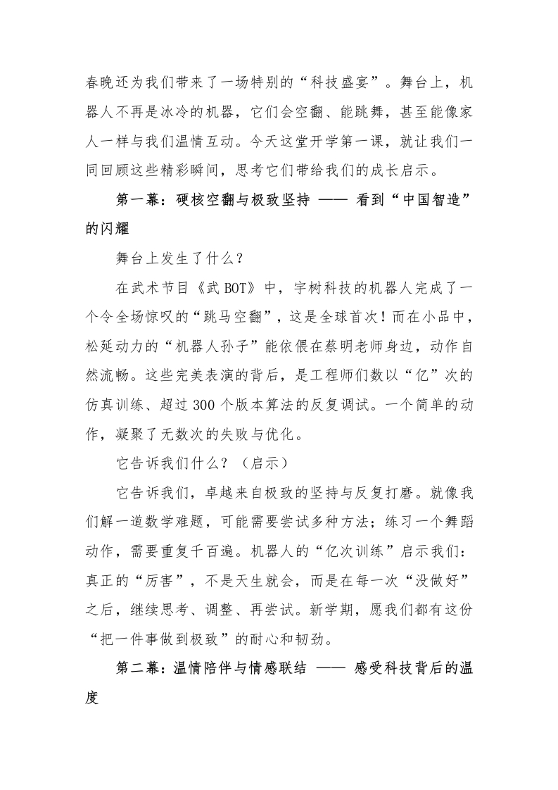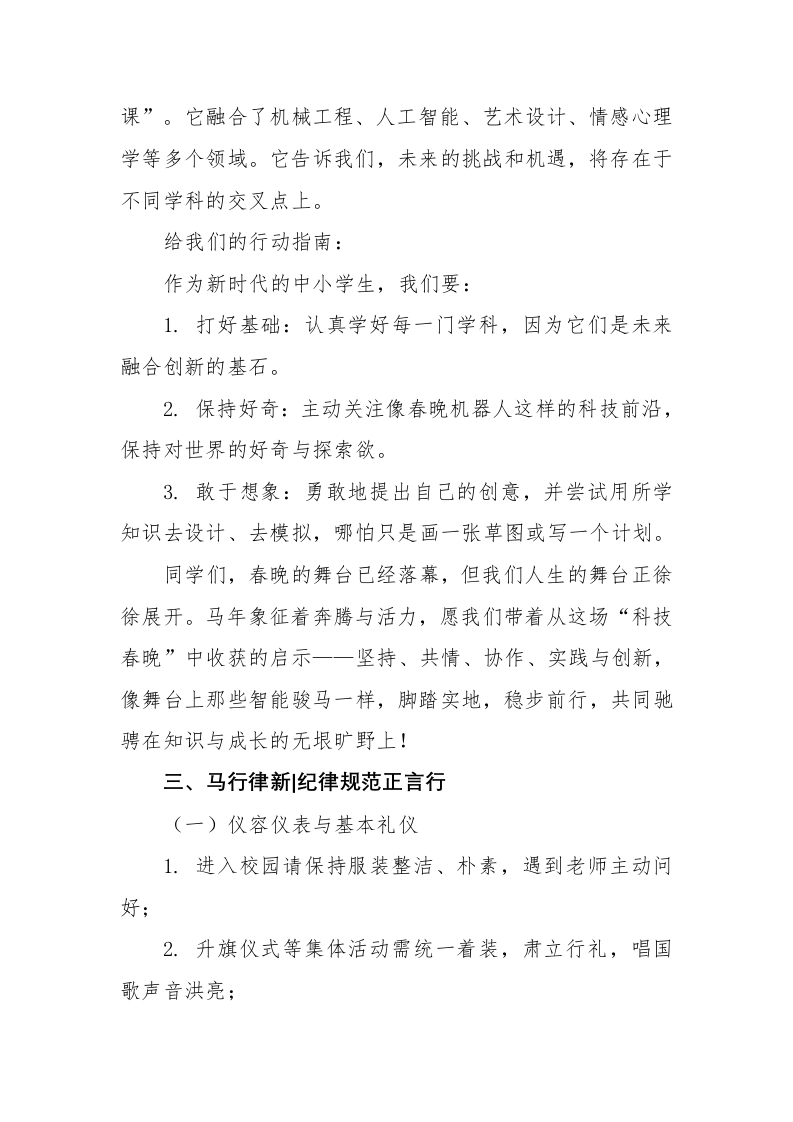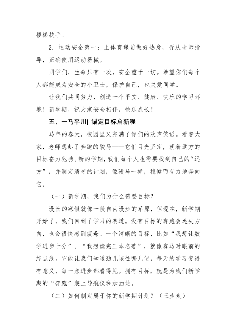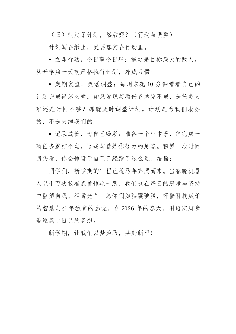 2025-2026学年第二学期开学第一课发言稿(智能骗跹蕴国风骐骥驰骋赴山海)亲爱的同学们:新年好!新学期好!今年春晚的机器人武术,大家一定记忆犹新吧?科技让未来变得那么酷!而今年也正是骐骥驰骋的马年,“骐骥”指的就是千里马,寓意着奔跑与奋进。愿我们新学期也能拥有这股劲头,像骏马一样目标明确,努力向前,共同开启一个充满活力与成长的新篇章!目录一、驹光暖意|马年假期关键词二、智骋千里科技春晚启新元三、马行律新纪律规范正言行四、蹄稳步安」校园安全护成长五、一马平川川锚定目标启新程一、驹光暖意|马年假期关键词同学们,马年新春的余温未散,生机勃勃的春季学期已然开启。寒假里面无论你做了什么,都是成长路上踏实的蹄印。现在,邀请几位同学来分享一下:这个2026年马年春季,你做了哪些特别或有意义的事?让我们在交流中,共同汲取前行的力量。二、智骋千里引科技春晚启新元这个春节,除了丰盛的年夜饭和压岁钱,2026年的央视