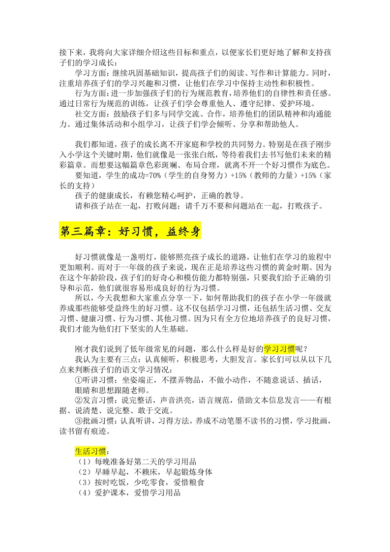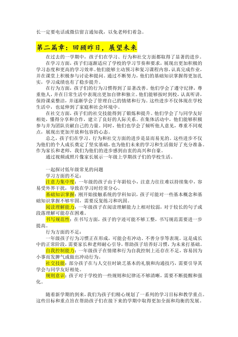 【一年级】【春季下】开学家长会:循序而上“习惯”成花讲稿晨晨老师19天前发布关注私信28.26KB8页02112 以下为资料部分截图预览,下载后为超高清原文件。 第1页 / 共8页 第2页 / 共8页 第3页 / 共8页 试读已结束,还剩5页,您可下载完整版后进行离线阅读 加入VIP,享海量教务资料,无限制免费下载所有材料 【一年级】【春季下】开学家长会:循序而上“习惯”成花讲稿此内容为付费资源,请付费后查看¥9.9¥15.9VIP会员免费代理(享70%分佣)免费立即购买您当前未登录!建议登陆后购买,可保存购买订单付费资源© 版权声明文章版权归作者所有,未经允许请勿转载。THE END其他资料 文本预览 循序而上“习惯”成花2026年一年级下学期开学家长会温馨提示:1.请家长安静坐在孩子的位置。2.请把手机静音或调到震动。3.请不要吸烟或随手扔垃圾。4.请不要将家长会内容上传网络。欢迎各位家长的到来!新一年,心相见。您的支持是我们教育工作的重要动力,衷心希望在未来的每一次家长会上,我们都能继续携手合作,共同为孩子们的成长保驾护航。为了能让孩子们尽快地适应校园的新生活,今天我们同各位家长们共同探讨如何根据低年级学生的特点,提高家庭教育的效果今天的家长会以“循序而上“习惯”成花”为主题,主要从以下几个方面展开:1.安全为先,守护成长2.回顾昨日,展望未来3.好习惯,益终身4.抓住重点,爱上语文5.双向奔赴,静待花开第一篇章:安全为先,守护成长学习是首要,安全更重要。在学校里,我们每天都会关照学生,反复强调,注意安全,增强自我保护意识,校内外不做危险游戏,上学、放学路上不逗留,不玩耍,放学后家长要及时接孩子回家,相信各位家长和我们一样关心孩子的安全。(一)注重孩子的安全教育1.交通安全。教育孩子严格遵守交通规则,文明、安全乘车,未满12周岁不能骑自行车上路,不坐副驾驶:警惕汽车盲区。2.消防安全。教育孩子严格遵守当地燃放烟花爆竹的管理规定,不随便燃放烟花爆竹,最好做到不放:严防火灾:安全使用煤气。3.饮食安全。不吃三无垃圾食品、脏东西、坏东西。饭前便后洗手。4防溺水安全。教育孩子牢记防溺水六不准。年●●●●(二)注重孩子接送的问题1.上下学时间安排。上午:7:40到校,11:50中午放学:下午:2:30到校,5:10下午放学。2.学生的到校要求。上午、下午都提前10分钟到校,不要太早,以免孩子没人照看发生危险:为保证每位孩子的安全,学校规定学生上学、放学要求家长按时接送不要迟到。请家长记清楚接送时间:家长们送孩子上学请将孩子送到教室,与老师做好交接方可离校。家长们注意,如果孩子因病、因事不能到校,家 查看更多 收起部分 喜欢就支持一下吧点赞12 分享QQ空间微博QQ好友海报分享复制链接收藏