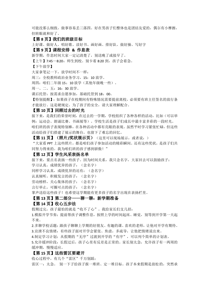 2026年春季二年级开学家长会发言稿发言人:x老师【第1页】主题:我们呀—恰逢迎春时各位家长朋友,大家晚上好!欢迎大家来参加咱们二(5)班2026年春季的开学家长会。今天咱们的主题是一一“我们呀一一恰逢迎春时”。你看,现在正值初春,外面的树枝开始冒芽了,咱们今天能坐在一起,为了孩子的事儿聊一聊,也是一种特别的缘分。春天是充满希望的季节,也是咱们孩子成长的新起点。所以,我想借这个美好的寓意,开启咱们今天的交流。【第2页】欢迎词“春有佳期,携爱而来”,感谢大家在百忙之中,带着对孩子的爱,来赴这场春约。美好的季节,有春暖花开,也有咱们作为家长和老师的“爱与责任”。咱们因为孩子相遇,因为信任而互相了解,也希望通过今天的沟通,咱们能更加真诚地携手同行!【第3页】今天的目录今天咱们要聊的内容比较多,我给大家梳理了一个目录:1.夸一夸:走进咱班一一认识老师和班级情况。2.聊一聊:新学期一一作息、回顾、收心、文具。3.唠一唠:二年级娃一一学习重点、习惯养成。4.想一想:家校共育一一孩子心理、家长角色、沟通技巧。5.记一记:安全教育一一校内外安全、温馨提示。【第4页】第一部分一一夸一夸:走进咱班【第5页】认识我们的老师:班主任兼语文老师首先,还是咱们的老朋友一一我,小李老师。电话是136xx,大家存一下,有事随时联系。我从事语文教学和班主任工作己经六年多了。这六年里,我一直坚持一个原则:踏实教书,用心育人。遵守工作纪律,团结同事,钻研业务,关爱学生一一这些是我每天都在做的事。这几年,我也先后获得过几次“优秀班主任”“教学能手”“优质课一等奖”之类的荣誉,但说实话,荣誉是虚的,孩子进步才是实的。【第6页】数学老师咱们班的数学是小张老师,电话是138xx。小张老师也有六年多的教学经验,同样是咱们学校的骨干。她这个人特别踏实、有耐心,对待工作一丝不苟,也获得过“教学能手”“优质课一等奖”。孩子们交给她,数学方面大家尽管放心。两位老师都是“老搭档”了,配合很默契。【第7页】认识我们的班级说完老师,再说说咱们的二(五)班。咱们班现在一共是45名孩子,其中女生20名,男生25名。整体来看,咱们班的孩子健康活泼,朝气蓬勃,走进教室就感觉很有生气。女生:大多乖巧文静,团结友爱。女孩子之间建立了很宝贵的友谊,是班里的“稳定器”。男生:男生占比较多,整体好动活泼,大多数性格开朗外向,但也比较粗枝大叶,比如写字