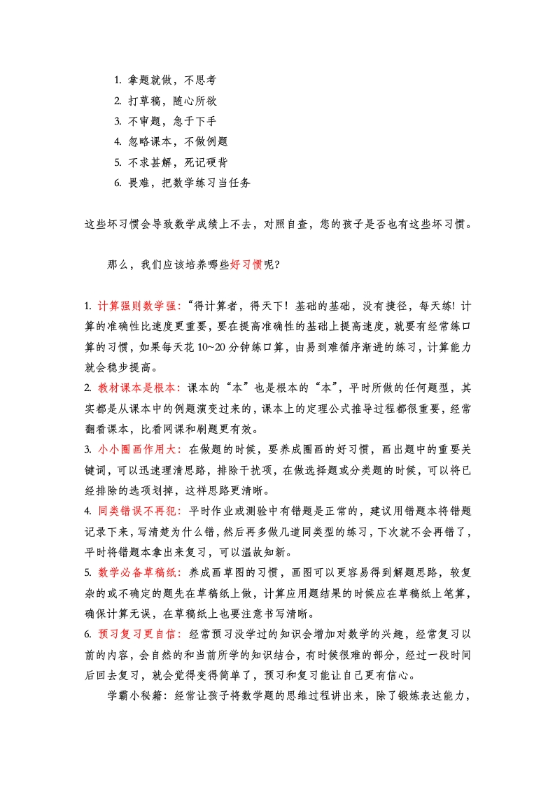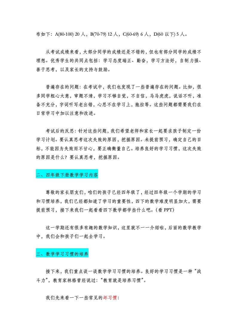 【四年级】【数学】【春季下】开学家长会:与数同行,共话梦想讲稿晨晨老师19天前发布关注私信19.23KB5页03713 以下为资料部分截图预览,下载后为超高清原文件。 第1页 / 共5页 第2页 / 共5页 第3页 / 共5页 试读已结束,还剩2页,您可下载完整版后进行离线阅读 加入VIP,享海量教务资料,无限制免费下载所有材料 【四年级】【数学】【春季下】开学家长会:与数同行,共话梦想讲稿此内容为付费资源,请付费后查看¥9.9¥15.9VIP会员免费代理(享70%分佣)免费立即购买您当前未登录!建议登陆后购买,可保存购买订单付费资源© 版权声明文章版权归作者所有,未经允许请勿转载。THE END其他资料 文本预览 与数同行,共话梦想四年级下数学开学家长会发言稿尊敬的各位家长朋友们:大家好!首先,我代表学校和四年级全体师生,衷心感谢大家在百忙之中抽出时间来参加这次家长会。关心、帮助、督促贵子女是我们共同的心愿,使您的孩子得到全面发展、提高是我们共同的目标。今天,我们相聚在这里,共同探讨孩子们的数学学习情况,希望在接下来的时间里,我们能够携手共进,助力孩子们的数学学习。班级学习情况整体情况:首先,我们来看一下班级的整体学习情况。在数学课堂上,大部分同学都能做到认真听讲,乐于回答问题,学习热情和参与度都比较高。在作业完成方面,大部分同学都能按时完成,有一定的自主性,部分同学完成质量高,写字工整,做题有自己的见解。个别学生情况:当然,每个班级都有一些表现突出的同学,值得表扬。比如张、赵x同学,他们在课堂上表现积极,作业完成情况也非常好。陈、江xx同学在数学学习上也有很大的进步,值得肯定。许x同学在数学思维方面表现突出,经常能提出一些独到的见解。但我们也注意到,个别同学还存在一些问题。比如,有些同学思想松懈、学习态度不端正,注意力不集中,听课效果不好,自制力差,做与上课无关的事。还有些同学作业完成情况差,做题习惯较差,字迹潦草,不认真完成,应付了事,甚至存在抄作业的问题。这些问题都需要我们共同关注,帮助孩子们改正。上学期期末考试情况:接下来,我们来看一下上学期期末考试的情况。本次考试我们不排名,主要是根据自家孩子的分数,掌握孩子学习水平。考试成绩分 查看更多 收起部分 喜欢就支持一下吧点赞13 分享QQ空间微博QQ好友海报分享复制链接收藏