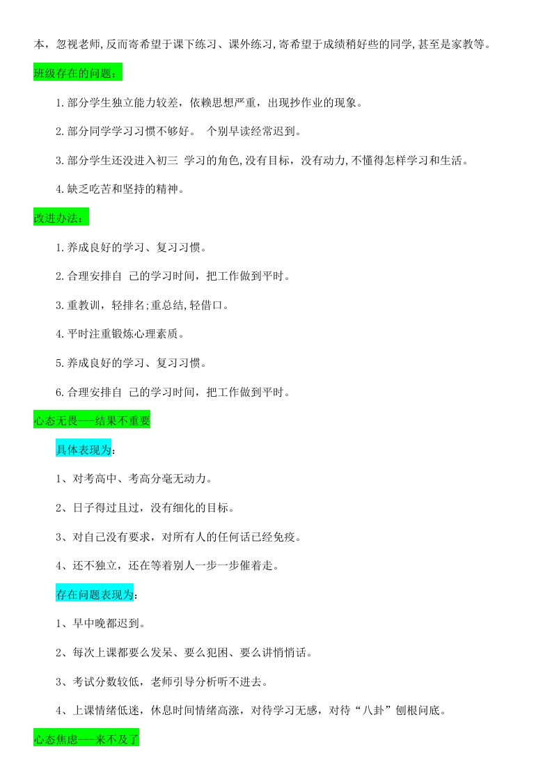 【初三】【考前冲刺】春季下学期家长会:同心共赴,中考加油!讲稿晨晨老师19天前发布关注私信24.06KB9页03210 以下为资料部分截图预览,下载后为超高清原文件。 第1页 / 共9页 第2页 / 共9页 第3页 / 共9页 试读已结束,还剩6页,您可下载完整版后进行离线阅读 加入VIP,享海量教务资料,无限制免费下载所有材料 【初三】【考前冲刺】春季下学期家长会:同心共赴,中考加油!讲稿此内容为付费资源,请付费后查看¥9.9¥15.9VIP会员免费代理(享70%分佣)免费立即购买您当前未登录!建议登陆后购买,可保存购买订单付费资源© 版权声明文章版权归作者所有,未经允许请勿转载。THE END其他资料 文本预览 “同心共赴,中考加油!”初三考前冲刺家长会发言稿尊敬的老师、亲爱的家长们:大家好!很高兴在今天的家长会上与大家相聚。孩子的成长是你我一生的事业!中考是一场比知识、比能力、比心理、比信心、比体力的综合考试。携九年锋芒,战百日时光,乘六月长风,破万里巨浪,本次家长会将分5个板块进行:了解一班级情况;理解一孩子的不易;认识一即将面临的中考;探讨一与孩子的相处方式;共育一做有远见的父母。一、了解一班级情况常规问题:1、迟到:家长关注睡眠问题、早起问题、交通问题:2、早餐:吃饱吃好,上午有大课间体育锻炼,营养要跟上:3、卫生:关注孩子的个人卫生、房间整理、督促整理资料:4、沟通:每天跟孩子沟通聊天,手机周一到周五管理好,周六日一小时,不可放任:5、体育:加强体育锻炼,游泳、跑步,但不可无专业指导,盲目训练。考试情况分析:1、本次考试总体成绩较为稳定,整体成绩较之.上次考试波动幅度不大,稳中有进。2、班级前十名有:输入孩子姓名3、部分学生成绩较上次有所下降。英语、语文两门成绩年级中排名第一、第二。4、成绩进步:输入孩子姓名成绩分析:语数外三科成绩看学生实力:剩余学科成绩看学生学习态度。优生要戒骄戒躁,给予适当压力:后进生要端正态度,家长和老师要紧密配合,防止掉队。中等生要多鼓励,挖掘潜力,期待黑马。存在的问题:想的多,做的少,说的多,实践少:目标高,坚持短:与不如自己对比的多,和优于自己对比的少太看重成绩和排名。而忽略了总结得失经验、努力改进才是最应该关注的。原因总结:进入初三后,老师讲课进度快,内容多,科目多,学生消化的时间不够。忽视课堂,忽视课 查看更多 收起部分 喜欢就支持一下吧点赞10 分享QQ空间微博QQ好友海报分享复制链接收藏