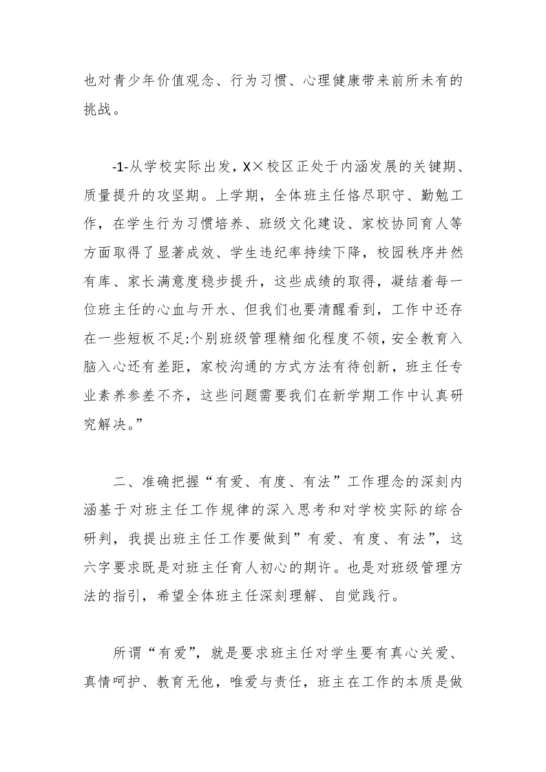 在XX中学X校区2026年春季学期第一次班主任工作会议上的讲话(精品)晨晨老师16天前发布关注私信18.13KB9页03213 以下为资料部分截图预览,下载后为超高清原文件。 第1页 / 共9页 第2页 / 共9页 试读已结束,还剩7页,您可下载完整版后进行离线阅读 加入VIP,享海量教务资料,无限制免费下载所有材料 在XX中学X校区2026年春季学期第一次班主任工作会议上的讲话(精品)此内容为付费资源,请付费后查看¥9.9¥15.9VIP会员免费代理(享70%分佣)免费立即购买您当前未登录!建议登陆后购买,可保存购买订单付费资源© 版权声明文章版权归作者所有,未经允许请勿转载。THE END计划汇报 文本预览 在X中学X校区2026年春季学期第一次班主任工作会议上的讲话(精品)同志们:春回大地,万象更新,值此新学期伊始之际,我们召开本次班主任工作会议,旨在统一思想、明确任务、压实责任、确保新学期各项工作开好局、起好步、刚才,总务处、校办公室、政教处负责同志分别就校国安全、后勤保障、网络安全、德育管理等工作了详细都署、各项安排具体明确、务实可行、希望全体班主任认真学习领会、抓好贯彻落实,借此机会,我就新学期班主任工作讲几点意见。一、深刻认识班主任工作的时代使命与战略意义教育是国之大计、党之大计,承担着立德树人的根本任务。班主任作为学校德育工作的核心力量、班级管理的第一责任人、学生成长路上的引路人,其工作质量和水平直接关系到学校办学品质的提升,关系到千家万户的切身利益,更关系到党和国家事业的未来发展,从宏观视角审视,当首教育改革发展进入深本区。”双减政策持续深化落地,教育评价改革稳步推进,学生成长环境日趋复杂多元、互联网技术的广泛应用深刻改变了信息传播方式和青少年社交模式,人工智能、大数据等新技术既为教育教学提供了新工具新手段, 查看更多 收起部分 喜欢就支持一下吧点赞13 分享QQ空间微博QQ好友海报分享复制链接收藏