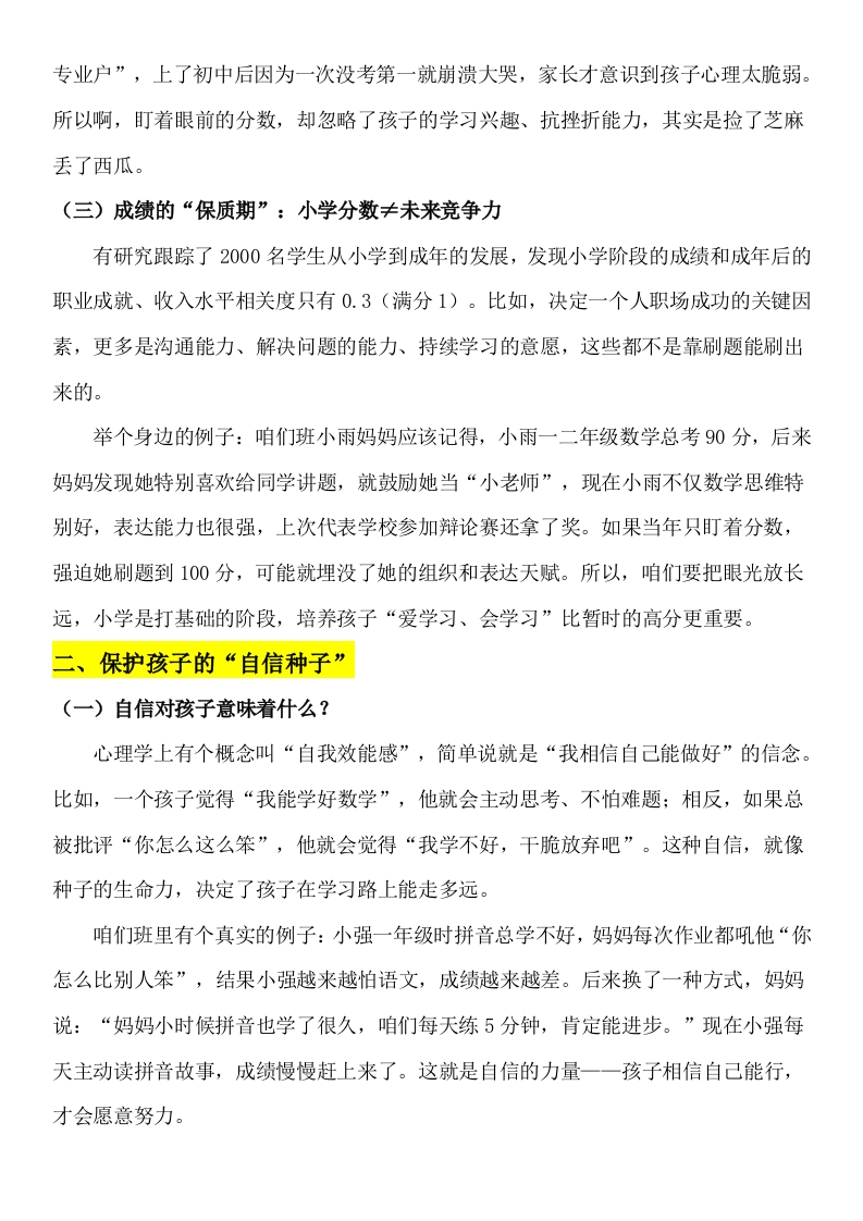 【通用】家长会:分数之外,孩子的成长更有力量讲稿晨晨老师16天前发布关注私信22.77KB7页02111 以下为资料部分截图预览,下载后为超高清原文件。 第1页 / 共7页 第2页 / 共7页 试读已结束,还剩5页,您可下载完整版后进行离线阅读 加入VIP,享海量教务资料,无限制免费下载所有材料 【通用】家长会:分数之外,孩子的成长更有力量讲稿此内容为付费资源,请付费后查看¥9.9¥15.9VIP会员免费代理(享70%分佣)免费立即购买您当前未登录!建议登陆后购买,可保存购买订单付费资源© 版权声明文章版权归作者所有,未经允许请勿转载。THE END综合资料 文本预览 分数之外,孩子的成长更有力量通用实用型·家长会一逐字稿我们要的是“会走路的孩子”,不是“会跑分的机器”本次家长会的主要内容分4部分进行:01成绩是学习的“温度计”;02保护孩子的“自信种子”;03成绩好or不好;04培养“能进步的孩子”。一、成绩是学习的“温度计”(一)成绩的本质:它在告诉我们什么?各位家长朋友,咱们先聊聊成绩到底是什么。您可以把成绩想象成医院里的体温计一一它能反映孩子当下的学习“体温”,比如哪些知识掌握得好,哪些地方有漏洞。比如数学考了85分,可能是计算粗心,也可能是应用题理解有偏差;语文作文扣了5分,可能是错别字多,或者段落衔接不自然。这些具体的问题,比分数本身更重要。但咱们得明白,体温计只能测体温,不能测身高、体重,更不能决定一个人活得是否开心、有没有创造力。就像班里有的孩子成绩中等,但特别会关心同学,动手能力超强:有的孩子数学不好,但唱歌画画特别有灵气。成绩只是孩子成长的一个维度,绝不是全部。(二)当下的误区:我们为什么总盯着100分?现在社会上有一种风气,把成绩当成了“硬通货”:小区里见面聊“你家孩子考多少分”,亲戚聚会比“年级排名第几”,甚至有些家长觉得“考不上985/211就没出路”。这种焦虑让咱们不自觉地把分数看得太重,比如孩子考了98分,第一反应不是“不错呀,哪里学得好”,而是“那2分丢在哪儿了”;考了80分,马上觉得“是不是上课不认真,要不要报补习班”。咱们仔细想想,小学阶段的100分真的能决定未来吗?我教过一个学生,小时候数学总考90分左右,家长没少着急,但他特别喜欢拆闹钟、做手工,后来考上了重点高中的科技班,现在在大学读机械工程专业,特别优秀。相反,当年班里有个“满分 查看更多 收起部分 喜欢就支持一下吧点赞11 分享QQ空间微博QQ好友海报分享复制链接收藏