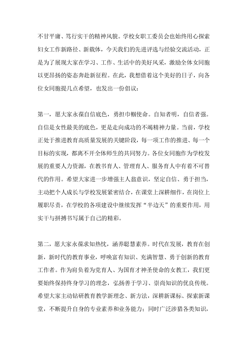 2026年三八妇女节座谈会校长讲话:与巾帼同行,共筑美好校园,共创幸福生活晨晨老师16天前发布关注私信12.89KB4页0268 以下为资料部分截图预览,下载后为超高清原文件。 第1页 / 共4页 第2页 / 共4页 试读已结束,还剩2页,您可下载完整版后进行离线阅读 加入VIP,享海量教务资料,无限制免费下载所有材料 2026年三八妇女节座谈会校长讲话:与巾帼同行,共筑美好校园,共创幸福生活此内容为付费资源,请付费后查看¥9.9¥15.9VIP会员免费代理(享70%分佣)免费立即购买您当前未登录!建议登陆后购买,可保存购买订单付费资源© 版权声明文章版权归作者所有,未经允许请勿转载。THE END校长工作 文本预览 2026年三八妇女节座谈会校长讲话:与巾帼同行,共筑美好校园,共创幸福生活尊敬的各位领导、来宾,亲爱的女同胞们:大家好!春和景明,万物生辉,在这繁花绽放的三月,我们欢聚一堂,共同庆祝第116个“三八”国际劳动妇女节。首先,我谨代表学校党支部、校委会及工会,向莅临本次座谈会的各位领导、来宾表示热烈的欢迎和衷心的感谢!也向全校每一位女教工、女同胞,致以最诚挚的节日问候和最美好的祝福!祝大家节日快乐、工作顺遂、阖家幸福、芳华永驻!在我们学校,女教工的比例占到全校教职工的近半数,你们是学校教育教学、管理服务各条战线上的中坚力量,是校园里最靓丽的风景线。多年来,大家扎根岗位、勤勉务实、敬业奉献,在课堂教学、德育育人、行政服务、校园建设等各个领域发光发热,用专业与坚守诠释着新时代女性的担当,为学校的高质量发展倾注了心血、贡献了力量。过去的一年,我校女同胞们更是锐意进取、奋勇争先,在“巾帼建功标兵”“精品课堂打造”“学习型教师培育”等活动中屡创佳绩,多个女职工岗位获评校级“巾帼示范岗”,用实际行动展现了我校女教工 查看更多 收起部分 喜欢就支持一下吧点赞8 分享QQ空间微博QQ好友海报分享复制链接收藏