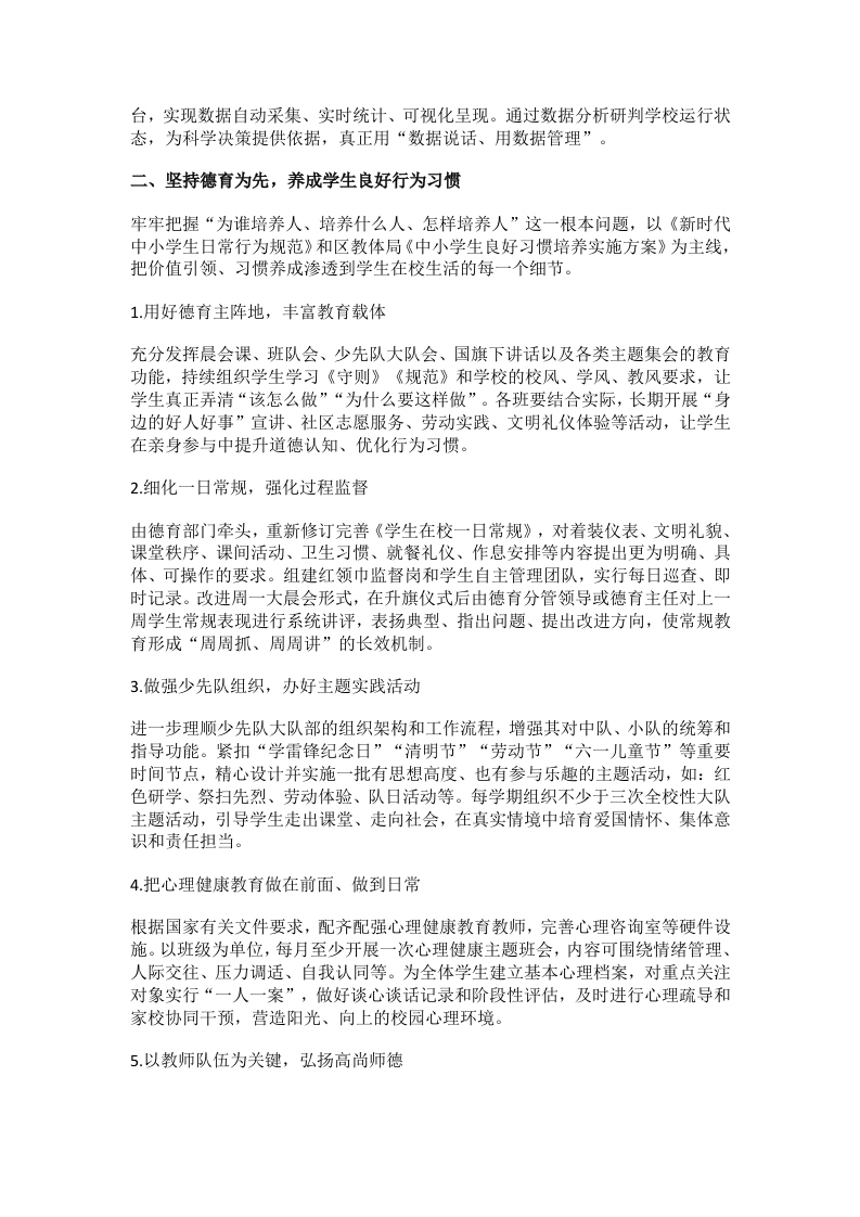 新学期,学校工作的总体思路是:以提升治理效能为突破口,以立德树人为根本,以教学质量为生命线,统筹推进管理、德育和课堂建设,努力办好人民满意的教育。一、围绕精细管理,提高学校治理效能我们将始终把“精细化、规范化、常态化”作为学校管理的基本遵循,着力在“有章可循、执行有力、过程可控、结果可评”上下功夫。1.坚决把“双减”和“五项管理”落到实处持续抓好“双减”政策和中小学生“五项管理”的落实,把课程开设、作业布置、考试安排、课后服务、手机管理、睡眠管理、读物管理、体质健康管理等工作全部纳入规范运行轨道。严格执行上级关于课时、作业总量、考试次数等方面的各项规定,坚决杜绝违规补课、超标超前教学等现象,确保办学行为依法依规、有序可控。2系统梳理制度,完善学校管理规程对学校现有的各类规章制度进行一次“全面体检”。围绕教育教学管理、后勤服务、师德师风、学生管理、安全卫生等重点领域,逐项排查、补缺补漏,该废止的废止,该修订的修订,该新建的抓紧建起来。力争形成一套比较完备、相互衔接、操作性强的制度体系,做到每个岗位有职责、每项工作有流程、每个环节有依据。3.发挥片区协同优势,拓宽办学视野进一步畅通与片区内兄弟学校的联系渠道,主动对接、主动交流。通过校际互访、联合教研、专题研修、管理经验分享等方式,相互借鉴、相互学习,在教学管理、德育模式、社团建设、家校共育等方面取长补短,推动我校管理理念和管理方式不断优化升级。4.强化过程督查,提升制度执行力在现有管理框架基础上,实施“分块负责、层层落实”的工作机制。对教学常规德育常规、卫生秩序、安全管理、后勤保障等重点内容,细化责任到人,明确检查标准和频次,做到日有记录、周有通报、月有小结、期末总评。每周教师例会如实反馈督查情况,并将执行结果与绩效工资、评优评先、职称申报等挂钩,用刚性的制度约束保证制度落地生根。5.推进智慧管理,提升决策的科学性加快信息化在学校管理中的应用,逐步建设和完善学校智慧管理平台。将教学进度、课堂听评课、教师考勤、学生到校离校、违纪记录、活动参与等信息纳入平