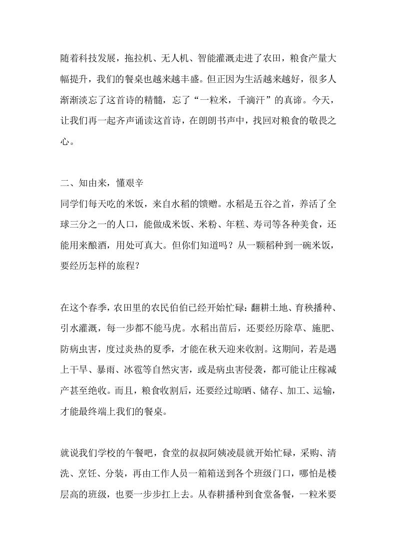 2026年春季学期校长思政课上讲话:春种知不易,争做“粮心”人晨晨老师16天前发布关注私信14.30KB5页0336 以下为资料部分截图预览,下载后为超高清原文件。 第1页 / 共5页 第2页 / 共5页 试读已结束,还剩3页,您可下载完整版后进行离线阅读 加入VIP,享海量教务资料,无限制免费下载所有材料 2026年春季学期校长思政课上讲话:春种知不易,争做“粮心”人此内容为付费资源,请付费后查看¥9.9¥15.9VIP会员免费代理(享70%分佣)免费立即购买您当前未登录!建议登陆后购买,可保存购买订单付费资源© 版权声明文章版权归作者所有,未经允许请勿转载。THE END校长工作 文本预览 2026年春季学期校长思政课上讲话:春种知不易,争做“粮心”人亲爱的老师们、同学们:大家早上好!春回大地,万物复苏,在这播种希望、孕育生长的2026年春季学期,我们迎来了新学期的思政第一课。春风吹绿了校园的草木,也让“春种一粒粟,秋收万颗子”的古老智慧,在这个季节有了最鲜活的意义。根据国家统计局2025年公布的数据,我国夏粮总产量再创新高,连续多年实现稳定增长,沉甸甸的粮食背后,是亿万劳动者的汗水与坚守。今天,我想和大家聊聊一个看似平凡却意义重大的话题一一《春种知不易,争做“粮心”人》。一、诵古诗,忆初心“锄禾日当午,汗滴禾下土。谁知盘中餐,粒粒皆辛苦。”这首《悯农》,想必每个同学都能脱口而出,老师们也耳熟能详。小时候背诵,或许只是觉得朗朗上口:如今再读,尤其是在这个播种的春季,我们更该读懂诗句里的重量。“民以食为天”,吃饱穿暖是人类生存的根本,而在古代,农业技术落后,种粮全靠天吃饭、靠手劳作,一粒米的收获远比我们想象中艰难。 查看更多 收起部分 喜欢就支持一下吧点赞6 分享QQ空间微博QQ好友海报分享复制链接收藏