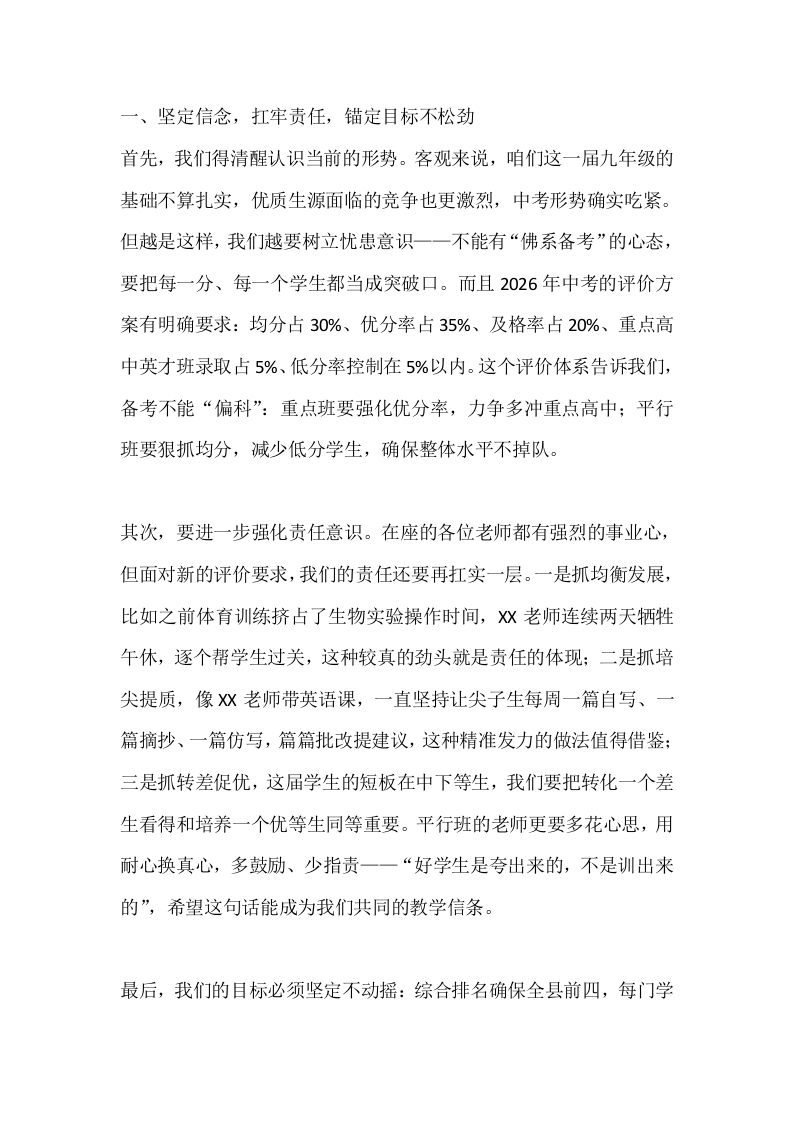 2026年春季学期中考备考暨九年级教师工作会议校长讲话:坚定信念靶向发力,科学备考再创辉煌晨晨老师16天前发布关注私信14.12KB5页04014 以下为资料部分截图预览,下载后为超高清原文件。 第1页 / 共5页 第2页 / 共5页 试读已结束,还剩3页,您可下载完整版后进行离线阅读 加入VIP,享海量教务资料,无限制免费下载所有材料 2026年春季学期中考备考暨九年级教师工作会议校长讲话:坚定信念靶向发力,科学备考再创辉煌此内容为付费资源,请付费后查看¥9.9¥15.9VIP会员免费代理(享70%分佣)免费立即购买您当前未登录!建议登陆后购买,可保存购买订单付费资源© 版权声明文章版权归作者所有,未经允许请勿转载。THE END校长工作 文本预览 2026年春季学期中考备考暨九年级教师工作会议校长讲话:坚定信念靶向发力,科学备考再创辉煌各位九年级的老师们:大家下午好!春回校园,中考的脚步也越来越近了。今天把大家召集过来,一方面是想和大家统一思想、凝聚共识,另一方面也是想和大家一起梳理备考思路、细化工作措施。首先,要感谢开学以来各位老师在教学和班级管理中的主动担当和辛勤付出一一从课堂教学到课后辅导,从体育训练到实验操作准备,大家都扛着责任、顶着压力,这份敬业精神值得肯定!同时也想跟大家说声抱歉,因为前期各项工作衔接,直到今天才召开这次九年级专题会议,后续我们会更及时地和大家沟通协作。2026年中考,对我们学校、对在座的每一位老师,都是一次关键考验。教学质量是学校的生命线,而中考成绩直接关系到学校的发展前景,关系到我们接下来的招生口碑,更关系到各位老师的职业成就感和相关福利。所以今天,我不想说太多空泛的话,就围绕“坚定信念、科学备考”这八个字,和大家聊些实在的想法,也盼着大家多提建议,一起把九年级的备考工作做细做实。 查看更多 收起部分 喜欢就支持一下吧点赞14 分享QQ空间微博QQ好友海报分享复制链接收藏