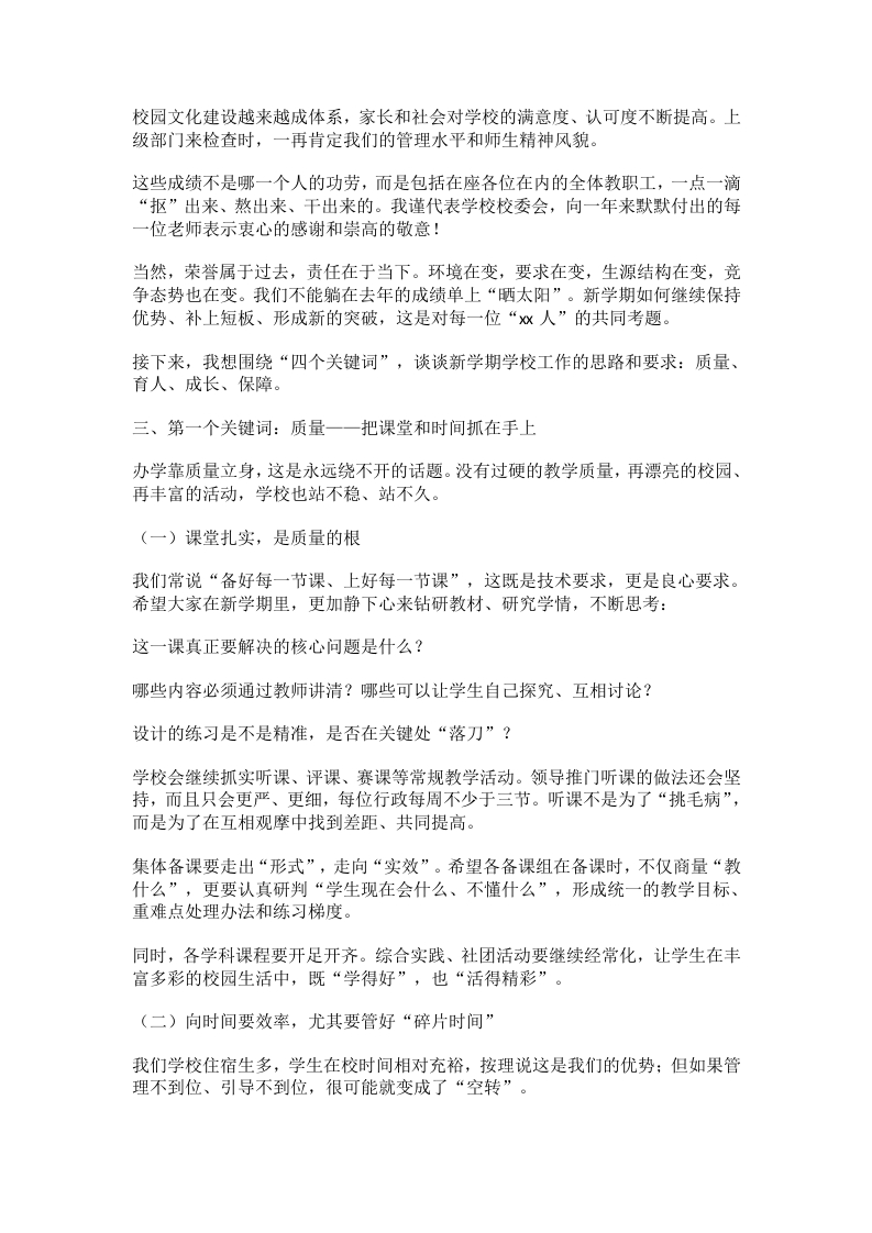 各位老师,上午好!一转眼,我们又在熟悉的操场、熟悉的会议室里见面了。窗外已经是草长莺飞的时节,假期的脚步还仿佛在耳边,但新的学期已经实实在在地摆在我们面前。看着大家精神饱满地坐在这里,我心里是踏实的、欣慰的。可以说,过去二十多天的休整,不仅让我们恢复了体力,更积蓄了继续前行的勇气和力量。新学期意味着新的起点,也意味着新的责任和新的考验。今天把大家请到这里,就是想和各位老师一起,回顾我们走过的路,认清我们面临的形势,谋划好接下来的每一步:这既是一次工作部署会,也是一次思想动员会,更是一场“心往一处想、劲往一处使”的碰头会。一、欢迎新同事加入,凝聚“一个团队”的力量先请允许我代表学校,对本学期新加入的各位老师表示热烈的欢迎!本学期,我们的教师队伍又注入了几位新鲜的血液,他们是:x老师、X老师、XX老师…有的刚走出校园,朝气蓬勃:有的带着丰富的教学经验加盟,为学校发展增添了新的动力。不论年龄大小、不论来处何方,从今天起,我们都有了一个共同的名字一一“x人”。真诚希望新老师们把这里当作自己的家,在x学校工作顺心、生活安心、发展放心:也希望老教师们多伸出援手,在业务上多一点指点,在生活上多一声问候,在班级管理、课堂驾驭、家校沟通等方面,把自己的“独门秘诀”慷慨分享出来,让“传帮带”真正落在实处。二、回望过去一年:肯定成绩,储备信心过去的一年,大家都很辛苦,也很有收获。县教体局安排的各项工作,我们一项一项地抓、一件一件地做,最终都交上了合格甚至优秀的答卷。简单概括,有三个词可以形容我们的去年:第一个词是“更完善”。学校硬件条件持续改善,教室、功能室、操场、图书室等一个个焕然一新,很多来校参观的人都说,“想不到一所乡镇学校能建得这么规整、这么有味道”。第二个词是“有提升”。教学质量稳步上升,在上学期全县教学质量抽测中,我们处在前列位置:老师们在县、市乃至更高层级的优质课、基本功大赛、论文评比中屡屡获奖:学生社团活动也办得有声有色,艺术、体育、科技、阅读等各方面都有亮点。第三个词是“好口碑”。