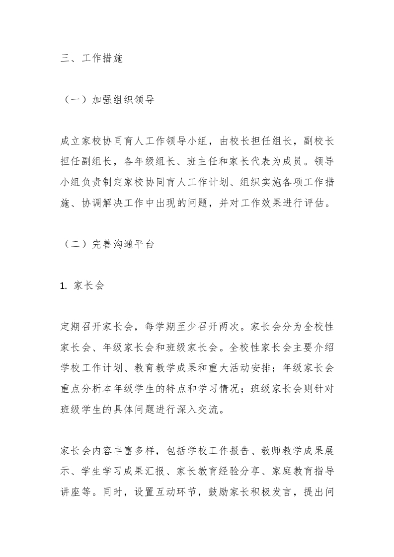家校协同育人工作实施方案:确保工作的规范化和制度化晨晨老师11天前发布关注私信15.25KB9页02911 以下为资料部分截图预览,下载后为超高清原文件。 第1页 / 共9页 第2页 / 共9页 试读已结束,还剩7页,您可下载完整版后进行离线阅读 加入VIP,享海量教务资料,无限制免费下载所有材料 家校协同育人工作实施方案:确保工作的规范化和制度化此内容为付费资源,请付费后查看¥9.9¥15.9VIP会员免费代理(享70%分佣)免费立即购买您当前未登录!建议登陆后购买,可保存购买订单付费资源© 版权声明文章版权归作者所有,未经允许请勿转载。THE END家校协同 文本预览 家校协同育人工作实施方案:确保工作的规范化和制度化一、指导思想以促进学生全面发展为根本,以提高家长教育水平和家校共育效果为目标,整合学校、家庭和社会资源,构建全方位、多层次的家校协同育人体系,形成教育合力,共同为学生的成长创造良好的环境。二、工作目标1.建立健全家校沟通机制,提高家校沟通的效率和质量,促进家长与学校之间的相互理解和信任。2.增强家长教育意识,提升家长教育能力,引导家长积极参与学校教育教学活动,形成家校共育的良好氛围。3.通过家校协同育人,提高学生的学习成绩、品德修养和综合素质,促进学生全面发展。 查看更多 收起部分 喜欢就支持一下吧点赞11 分享QQ空间微博QQ好友海报分享复制链接收藏