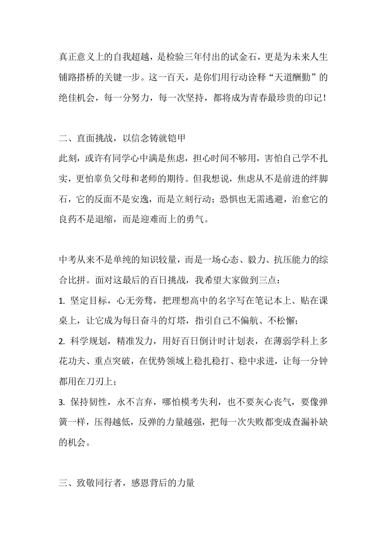 2026届中考百日誓师大会校长致辞稿:百日冲刺行动指南,三个备考锦囊晨晨老师11天前发布关注私信15.58KB6页03513 以下为资料部分截图预览,下载后为超高清原文件。 第1页 / 共6页 第2页 / 共6页 试读已结束,还剩4页,您可下载完整版后进行离线阅读 加入VIP,享海量教务资料,无限制免费下载所有材料 2026届中考百日誓师大会校长致辞稿:百日冲刺行动指南,三个备考锦囊此内容为付费资源,请付费后查看¥9.9¥15.9VIP会员免费代理(享70%分佣)免费立即购买您当前未登录!建议登陆后购买,可保存购买订单付费资源© 版权声明文章版权归作者所有,未经允许请勿转载。THE END校长讲话 文本预览 2026届中考百日誓师大会校长致辞稿:百日冲刺行动指南,三个备考锦囊尊敬的各位老师、家长朋友们,亲爱的同学们:大家好!今天,我们怀着庄严而激昂的心情相聚于此,共同见证2026届中考百日倒计时的重要时刻!此刻,春风送暖,万物生长,中考的战鼓己然擂响,冲刺的号角在校园上空回荡。站在这里,看着大家眼中闪烁的光芒,作为校长,我既为你们三年来的成长与蜕变倍感自豪,更对这百日冲刺的征程充满无限期待!一、回望来时路,致敬奋斗的青春同学们,三年前,你们带着稚气与憧憬踏入校园,成为这里的一抹新绿。这三年,你们在书山学海中磨砺心智,在课堂上凝神思索,在题海中锤炼本领,在运动会上奋力拼搏,在各类校园活动中绽放光彩:这三年,你们经历过考试失利的沮丧,也品尝过突破自我的喜悦,在挫折与收获中慢慢褪去青涩,长成了意气风发的少年。如今,你们站在了百日冲刺的起,点,即将迎来初中生涯的终局之战。我想告诉大家,中考从来不是人生的终点,而是你们青春路上第一次 查看更多 收起部分 喜欢就支持一下吧点赞13 分享QQ空间微博QQ好友海报分享复制链接收藏