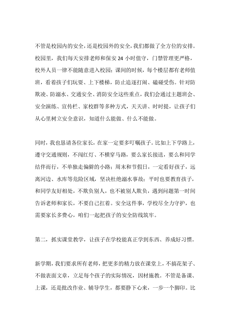 2026年春季学期开学家长会校长致辞:陪孩子稳稳起步,家校一起向前走!晨晨老师11天前发布关注私信14.31KB5页0245 以下为资料部分截图预览,下载后为超高清原文件。 第1页 / 共5页 第2页 / 共5页 试读已结束,还剩3页,您可下载完整版后进行离线阅读 加入VIP,享海量教务资料,无限制免费下载所有材料 2026年春季学期开学家长会校长致辞:陪孩子稳稳起步,家校一起向前走!此内容为付费资源,请付费后查看¥9.9¥15.9VIP会员免费代理(享70%分佣)免费立即购买您当前未登录!建议登陆后购买,可保存购买订单付费资源© 版权声明文章版权归作者所有,未经允许请勿转载。THE END校长讲话 文本预览 2026年春季学期开学家长会校长致辞:陪孩子稳稳起步,家校一起向前走!各位家长朋友,大家好!今天能和各位欢聚在咱们学校,我心里特别高兴。首先,我代表学校全体老师和工作人员,真心感谢大家在百忙之中抽出时间,来参加这次开学家长会。咱们都是为人父母,都盼着孩子能越来越好,所以今天咱们就像拉家常一样,好好聊聊孩子,聊聊新学期的日子,核心就一个一一陪孩子稳稳起步,家校一起向前走。过完这个春节,天气一天天暖和起来,草木发芽、万物复苏,咱们的孩子也背着书包,重新回到了熟悉的校园,开启了2026年春季学期的新征程。看着孩子们一张张朝气蓬勃的笑脸,不管是一年级刚适应校园的小不点,还是即将面临升学的高年级同学,都带着新的期待,这也是咱们做教育、做家长,最值得欣慰的一件事。在这里,我先跟大家简单说说,新学期学校的一些安排,都是实实在在、和孩子息息相关的事,大家一听就懂。第一,还是老话,安全永远是第一位的,这是咱们所有工作的底线,一点都不能含糊。 查看更多 收起部分 喜欢就支持一下吧点赞5 分享QQ空间微博QQ好友海报分享复制链接收藏