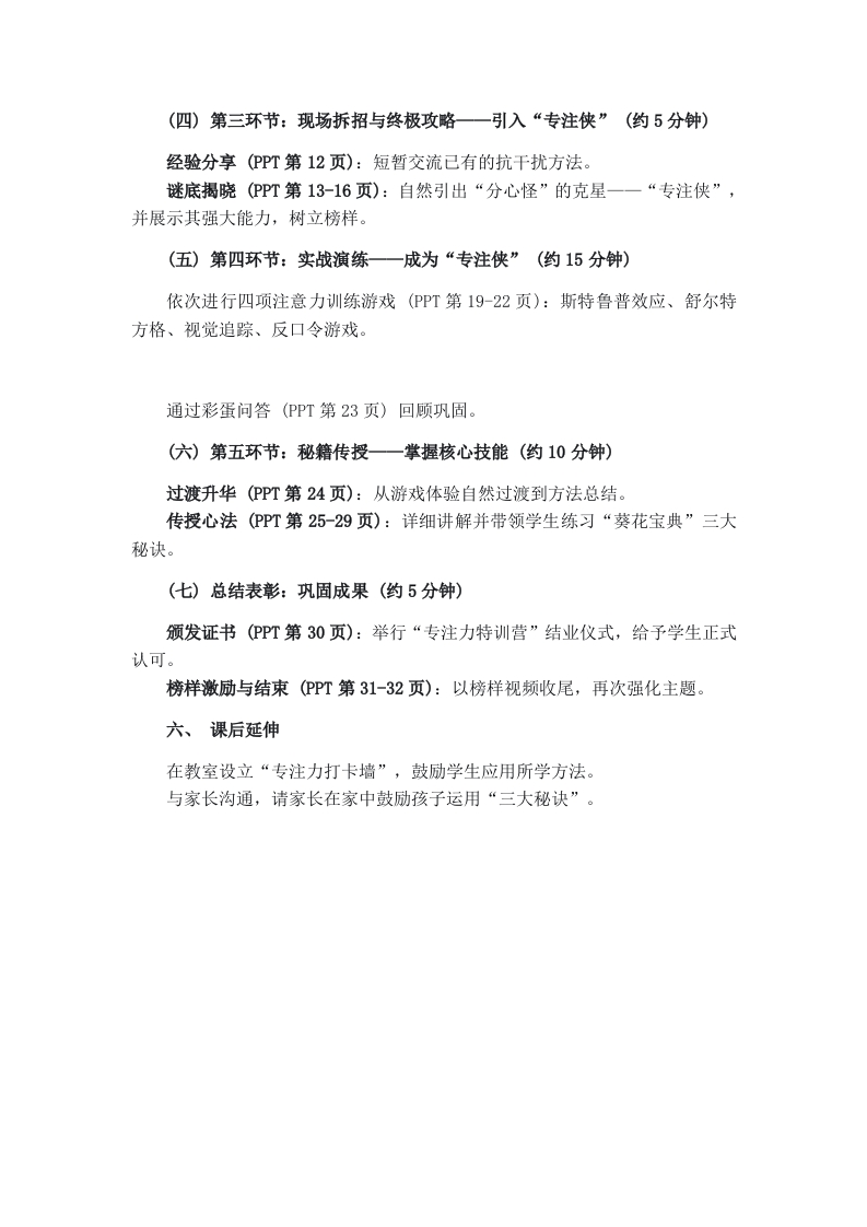 《告别课堂“分心怪”》主题班会教案一、班会背景在学习过程中,学生普遍存在注意力不集中、易受干扰的问题,直接影响课堂效率和学业成绩。本次班会旨在通过创设“分心怪”这一生动形象,将抽象的问题具象化,引导学生认识、了解并最终战胜分意力不集中的问题,掌握提升专注力的核心方法。二、班会目标认知目标:引导学生自我觉察,识别“分心怪”的出没规律与危害。情感目标:激发学生战胜分心的意愿,在互动中建立“我能专注”的信心。行为目标:掌握并能在实际中运用“按下暂停键”、“锁定单一任务”、“五分钟启动法”三大专注力策略。三、班会重点与难点重点:引导学生掌握并理解三大专注力策略的核心要领。难点:如何将课堂所学的策略转化为学生日常学习中的自觉行为。四、班会准备多媒体课件、计时器、结业证书、“分心怪”与“专注侠”形象图片或贴纸。五、班会流程(一)激趣导入:拉响“案情”警报(约5分钟)播放紧张有趣的警报音效,出示PPT第3页,以“校园紧急警报”的形式,用一连串诙谐的问题引发学生共鸣,宣布成立“打跑分心怪”行动组。(二)第一环节:索情警报一一看见“分心怪”(约8分钟)征集线索(PPT第5页):引导学生承认并分享自己曾被“分心怪”偷袭的经历。分享时刻(PPT第6-7页):鼓励学生具体描述分心情景,实现“知己知彼”。(三)第二环节:嫌犯档案一认清“分心怪”(约7分钟)绝密档案(PPT第9页):正式介绍“分心怪”的特征、作案手法与危害。出没规律(PPT第10页):引导学生总结分心怪出现的时机与害怕的时刻,初步建立应对信心。