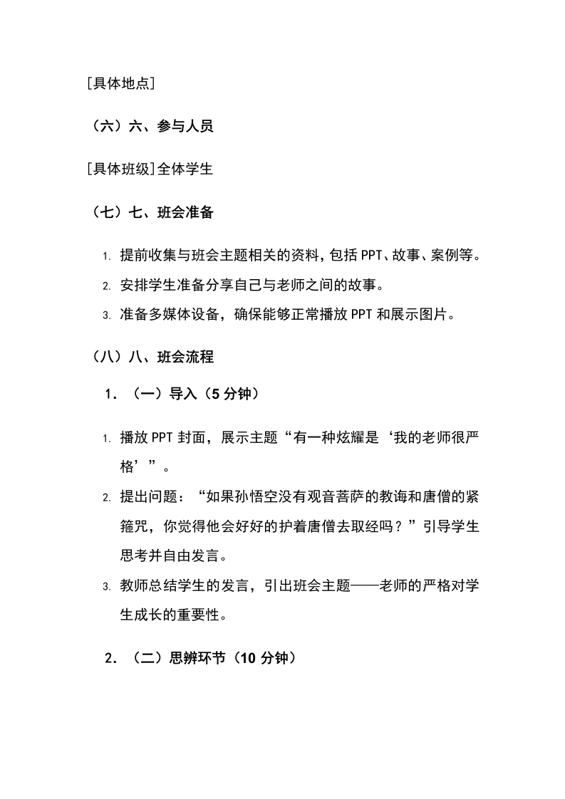 【感恩班会】有一种炫耀是“我的老师很严格”讲稿晨晨老师10天前发布关注私信16.91KB6页0295 以下为资料部分截图预览,下载后为超高清原文件。 第1页 / 共6页 第2页 / 共6页 试读已结束,还剩4页,您可下载完整版后进行离线阅读 加入VIP,享海量教务资料,无限制免费下载所有材料 【感恩班会】有一种炫耀是“我的老师很严格”讲稿此内容为付费资源,请付费后查看¥9.9¥15.9VIP会员免费代理(享70%分佣)免费立即购买您当前未登录!建议登陆后购买,可保存购买订单付费资源© 版权声明文章版权归作者所有,未经允许请勿转载。THE END综合资料 文本预览 一、感恩教育主题班会教案(一)一、班会主题有一种炫耀是“我的老师很严格”(二)二、班会背景在学生的成长过程中,老师扮演着至关重要的角色。然而,部分学生可能对老师的严格要求存在误解,不能理解老师严厉背后的关爱。本次班会旨在引导学生正确认识老师的严格,学会感恩老师,促进师生关系的和谐发展。(三)三、班会目的1.让学生明白老师的严格要求对自身成长的重要性,树立正确的师生观念。2.引导学生反思自己在面对老师批评和管教时的态度,培养感恩老师的情感。3.通过讨论和分享,增强学生与老师之间的理解和信任,营造良好的班级氛围。(四)四、班会时间[具体时间](五)五、班会地点 查看更多 收起部分 喜欢就支持一下吧点赞5 分享QQ空间微博QQ好友海报分享复制链接收藏