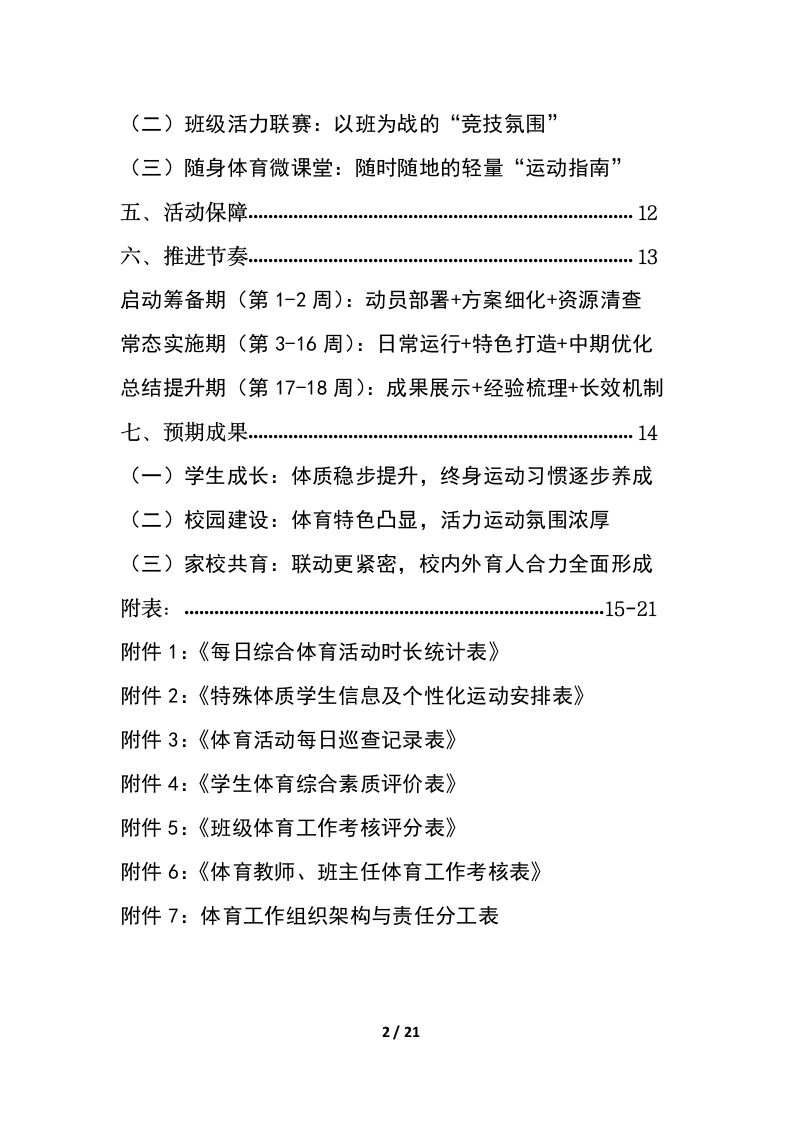 2026年春季学期学校综合体育活动2小时运动工作实施方案晨晨老师10天前发布关注私信20.19KB0.38MB21页05014 以下为资料部分截图预览,下载后为超高清原文件。 第1页 / 共21页 第2页 / 共21页 试读已结束,还剩19页,您可下载完整版后进行离线阅读 加入VIP,享海量教务资料,无限制免费下载所有材料 2026年春季学期学校综合体育活动2小时运动工作实施方案此内容为付费资源,请付费后查看¥9.9¥15.9VIP会员免费代理(享70%分佣)免费立即购买您当前未登录!建议登陆后购买,可保存购买订单付费资源© 版权声明文章版权归作者所有,未经允许请勿转载。THE END学校活动 文本预览 2026年春季学校综合体育2小时运动工作实施方案一、总体设计:构建“三维一体”体育育人新生态…3(一)育人维度:从“体质提升”到“全人发展”(二)时空维度:从“课堂教学”到“全天覆盖”(三)主体维度:从“教师主导”到“师生共创”二、目标体系:打造“三阶递进”体育发展新路径…4(一)基础阶:筑牢健康底线,实现“人人有运动”(二)提升阶:培育运动专长,实现“人人有特长”(三)引领阶:塑造体育精神,实现“人人有担当”三、落地体系:构建五维联动运行网…5(一)全时段安排:一日“运动闭环”,嵌入“校园日常”(二)分龄活动项:年级“运动菜单”,适配“成长节奏”(三)空间全利用:盘活“校园场地”,处处“运动场地”(四)全责任链条:多方“协同发力”,压实“每环责任”(五)全流程评价:数据“赋能跟踪”,形成“闭环管理”(六)特殊天气应急替代方案四、特色亮点:打造三大校园体育名片…11(一)校园体育嘉年华:全员乐享的“活力盛会”1/21 查看更多 收起部分 喜欢就支持一下吧点赞14 分享QQ空间微博QQ好友海报分享复制链接收藏