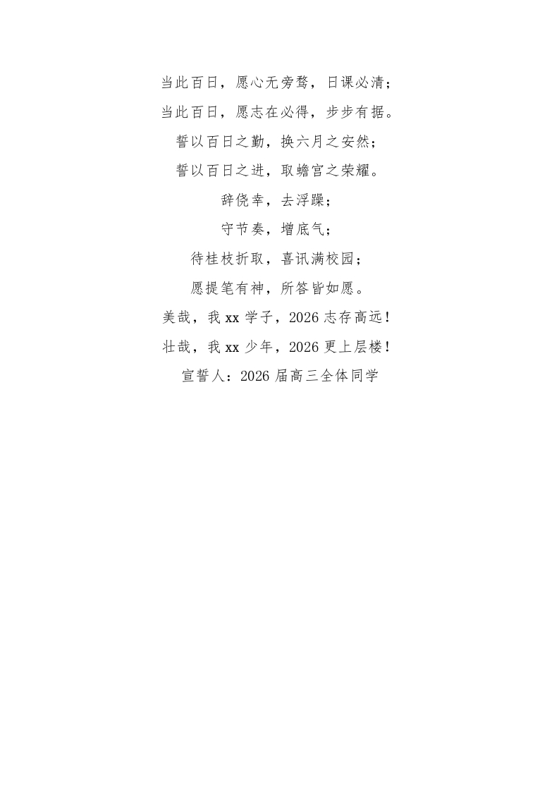 2026届百日誓师大会誓词一淬锋百日乘云六月以青春之名,谨在此宣誓:十载寒灯,披卷不辍,所学皆为今日;百日倒计,寸阴如金,所争只为此夏。鹏程在望,敢向青天借一羽:骏足方驰,誓将险阻踏为途。怀无畏之胆,立不移之志;守笃学之心,成自胜之功。忆往昔,积累成山,滴水穿石;看今朝,争分夺秒,寸步不让。当以要点为纲,条理分明:当以错因必究,举一反三。当以规范定胜,细微见高下;当以复盘正途,来路更从容。当此百日,愿破千卷而不懈,磨一技以至精:当此百日,愿登高处而不惧,越万难以向前。