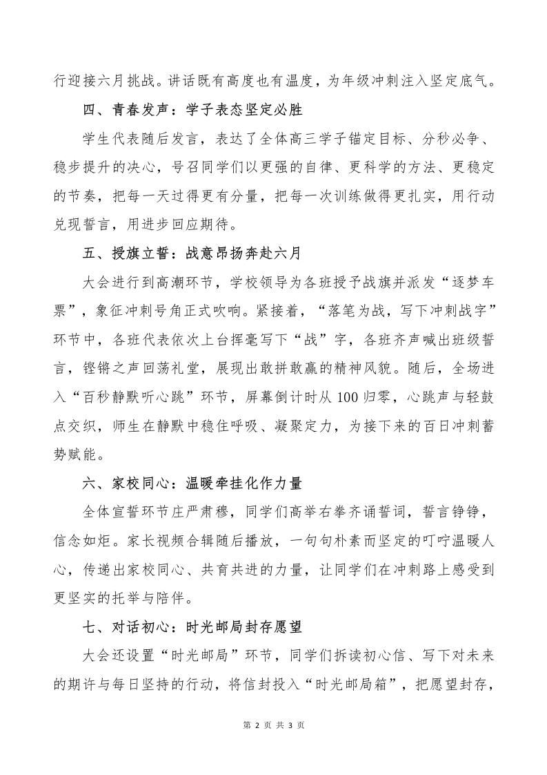 2026届百日誓师大会新闻稿晨晨老师6天前发布关注私信0.20MB3页0425 以下为资料部分截图预览,下载后为超高清原文件。 第1页 / 共3页 第2页 / 共3页 试读已结束,还剩1页,您可下载完整版后进行离线阅读 加入VIP,享海量教务资料,无限制免费下载所有材料 2026届百日誓师大会新闻稿此内容为付费资源,请付费后查看¥9.9¥15.9VIP会员免费代理(享70%分佣)免费立即购买您当前未登录!建议登陆后购买,可保存购买订单付费资源© 版权声明文章版权归作者所有,未经允许请勿转载。THE END学校活动 文本预览 2026届百日誓师大会新闻稿一你的未来,远比你看到的远春意渐浓,战鼓催征。为进一步凝聚高三师生冲刺合力,激发备考斗志,坚定必胜信念,近日,我校在礼堂举行2026届高三高考百日冲刺誓师大会暨一模成绩表彰活动。学校领导、高三全体师生及家长代表齐聚一堂,共同见证百日冲刺的重要时刻。一、庄重启幕:百日集结共赴征程大会在庄重而昂扬的氛围中拉开帷幕。鼓点渐强、主题画面点亮,全体师生迅速进入状态。百日不仅是时间的倒计时,更是行动的发令枪。现场秩序井然,气氛热烈,充分展现了高三年级蓄势待发的精气神。二、巨画展卷:凝聚同频点燃热情大会伊始,“巨画展卷,绘就青春蓝图”环节点燃全场。各班学生代表将“纳斯卡巨画”分块依次登台拼接铺展,巨幅画卷在舞台中央徐徐成形,强烈的视觉冲击与集体参与感瞬间点燃礼堂。每一块画面都是一份担当,每一次拼接都是一次同心,汇聚成全体高三学子同频共振的信念与力量。三、动员明志:校长寄语指明方向在动员讲话中,校长立足冲刺关键期,从目标定位、方法落实与心态稳定等方面为同学们指明方向,勉励大家把压力转化为行动,把愿望转化为清单,把坚持转化为能力,以更清晰的路径、更扎实的执第1页共3页 查看更多 收起部分 喜欢就支持一下吧点赞5 分享QQ空间微博QQ好友海报分享复制链接收藏