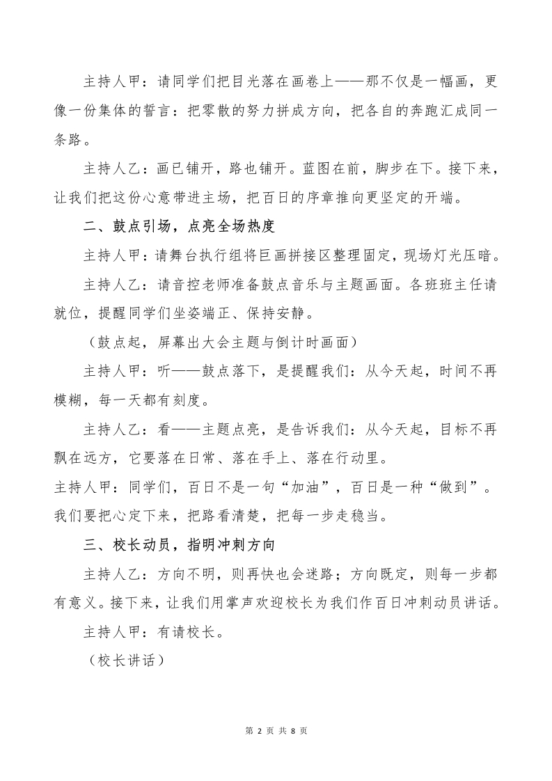 2026届百日誓师大会主持词晨晨老师6天前发布关注私信0.24MB8页04315 以下为资料部分截图预览,下载后为超高清原文件。 第1页 / 共8页 第2页 / 共8页 试读已结束,还剩6页,您可下载完整版后进行离线阅读 加入VIP,享海量教务资料,无限制免费下载所有材料 2026届百日誓师大会主持词此内容为付费资源,请付费后查看¥9.9¥15.9VIP会员免费代理(享70%分佣)免费立即购买您当前未登录!建议登陆后购买,可保存购买订单付费资源© 版权声明文章版权归作者所有,未经允许请勿转载。THE END学校活动 文本预览 2026届百日誓师大会主持词一你的未来,远比你看到的远主持人甲:尊敬的各位校领导、各位老师,主持人乙:亲爱的家长朋友们、同学们:合:大家下午好!主持人甲:春风拂面,万物向新;百日临近,心火更明。今天,我们相聚礼堂,共同迎来2026届高三高考百日冲刺誓师大会。主持人乙:这一场大会,不是把声音喊得更大,而是把信念立得更稳;不是把情绪推得更高,而是把行动落得更实。百日很短,短在转眼即至;百日很长,长在每一天都能改变你。主持人甲:现在,我们宣布一一2026届高三高考百日冲刺誓师大会正式开始!一、巨画展卷,绘就青春蓝图主持人乙:同学们,梦想从来不是一句话,它要被看见、被拼起、被铺开。接下来,我们将以一幅巨画开启今天的誓师一一巨画展卷,绘就青春蓝图。主持人甲:请各班巨画拼接代表按顺序从舞台右侧依次上台,将本班画块带到舞台中央指定区域。请大家保持安静,把掌声留给每一份认真与专注。主持人乙:当一块块画面在我们面前拼合,大家会发现:再宏大的图景,也来自每一次落笔;再远的六月,也由每一个今天抵达。第1页共8页 查看更多 收起部分 喜欢就支持一下吧点赞15 分享QQ空间微博QQ好友海报分享复制链接收藏