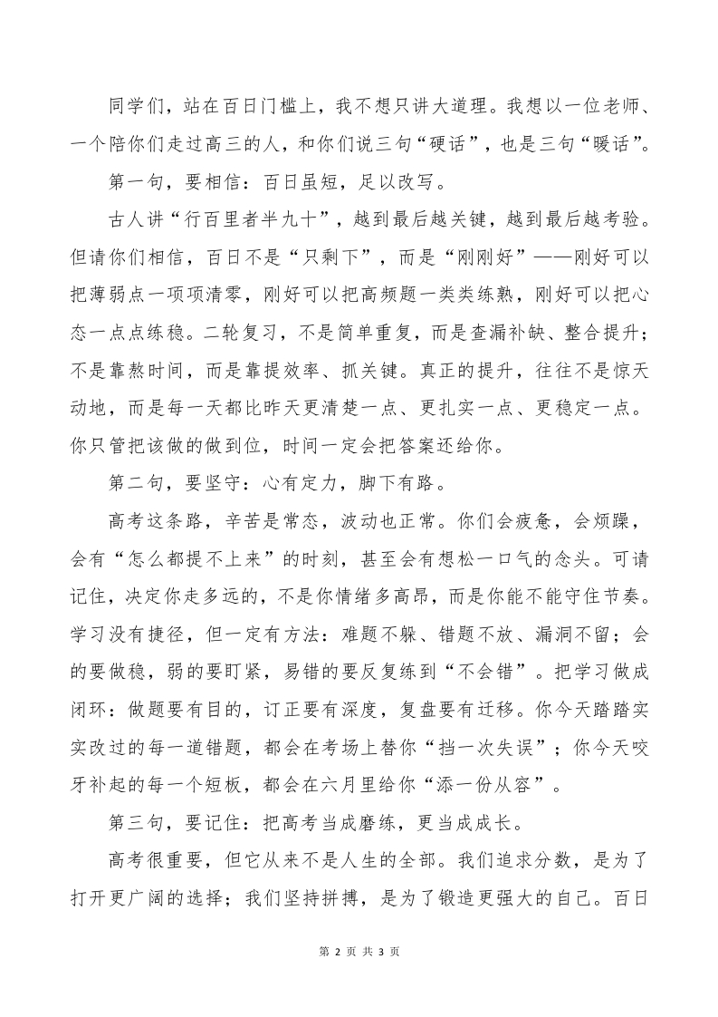 百日誓师大会教师讲话稿你的未来,远比你看到的远各位家长、各位老师,亲爱的同学们:大家下午好!今天,我们在这里隆重举行2026届高三高考百日冲刺誓师大会暨一模成绩表彰活动。首先,我代表高三全体教师,向一直以来信任学校、支持年级工作的家长朋友们,致以最真诚的感谢:向日复一日坚守讲台、精心备课的同事们,致以崇高的敬意;更要向正在题海中沉下心、在压力里仍向前的同学们,说一声:你们辛苦了!春意正盛,号角已响。距离2026年高考,只有宝贵的一百天。这一百天,是十二年寒窗的最后加速,是青春里最密集、最滚烫、也最值得铭记的时光。刚刚结束的一模,我们有同学收获了可喜的成绩,今天的表彰是对努力的看见。我也更想提醒大家:一模是一次“对照”,不是终点;表彰是一份“鼓劲”,不是包袱。成绩好的同学,要把优势守得更稳;暂时不理想的同学,更要把机会抓得更紧一一因为接下来的百日,完全可以把差距缩小,把短板补齐,把自己重新写一遍。2026,是奔腾向前的一年。我们常说“龙马精神”,不是一句漂亮的口号,而是一种状态:有向前的劲、有不服输的骨、有越到关键越能顶住的稳。愿你们把这份精神装进每天的学习里一一把热血放在早读里,把韧性放在错题里,把自信放在每一次复盘里。执笔为桨,以梦为帆,不必追求一时的喧哗,但一定要追求一步一个脚印的抵达。第1页共3页