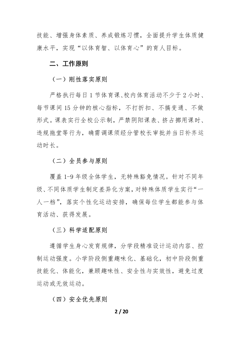 2026年春季学期义务教育阶段学校综合体育活动工作实施方案(细则版)晨晨老师6天前发布关注私信0.29MB20页0315 以下为资料部分截图预览,下载后为超高清原文件。 第1页 / 共20页 第2页 / 共20页 试读已结束,还剩18页,您可下载完整版后进行离线阅读 加入VIP,享海量教务资料,无限制免费下载所有材料 2026年春季学期义务教育阶段学校综合体育活动工作实施方案(细则版)此内容为付费资源,请付费后查看¥9.9¥15.9VIP会员免费代理(享70%分佣)免费立即购买您当前未登录!建议登陆后购买,可保存购买订单付费资源© 版权声明文章版权归作者所有,未经允许请勿转载。THE END学校活动综合资料 文本预览 2026年春季学校综合体育活动2小时体育工作实施细则为全面贯彻2026年新版《关于全面推进健康学校建设的指导意见》及学生体育工作刚性要求,牢固树立“健康第一”教育理念,坚守“以体育人、体质为先”工作原则,坚决破除“课间圈养”、体育课时挤占、运动形式化等突出问题,构建全天候、立体化综合体育活动体系,切实保障学生每日校内体育活动时长达标,助力学生德智体美劳全面发展,结合本校办学实际,制定本细则。一、指导思想以立德树人为根本任务,全面落实健康学校建设要求,严格执行体育工作指标。立足育人全局,锚定体育育人核心价值,构建“体育课刚性保障、大课间集中提质、课间微运动全覆盖、课后服务延伸拓展”的综合体育活动体系。通过规范化、常态化、科学化开展体育活动,破解当前校园体育工作痛点难点,切实保障学生运动权益,帮助学生掌握运动1/20 查看更多 收起部分 喜欢就支持一下吧点赞5 分享QQ空间微博QQ好友海报分享复制链接收藏