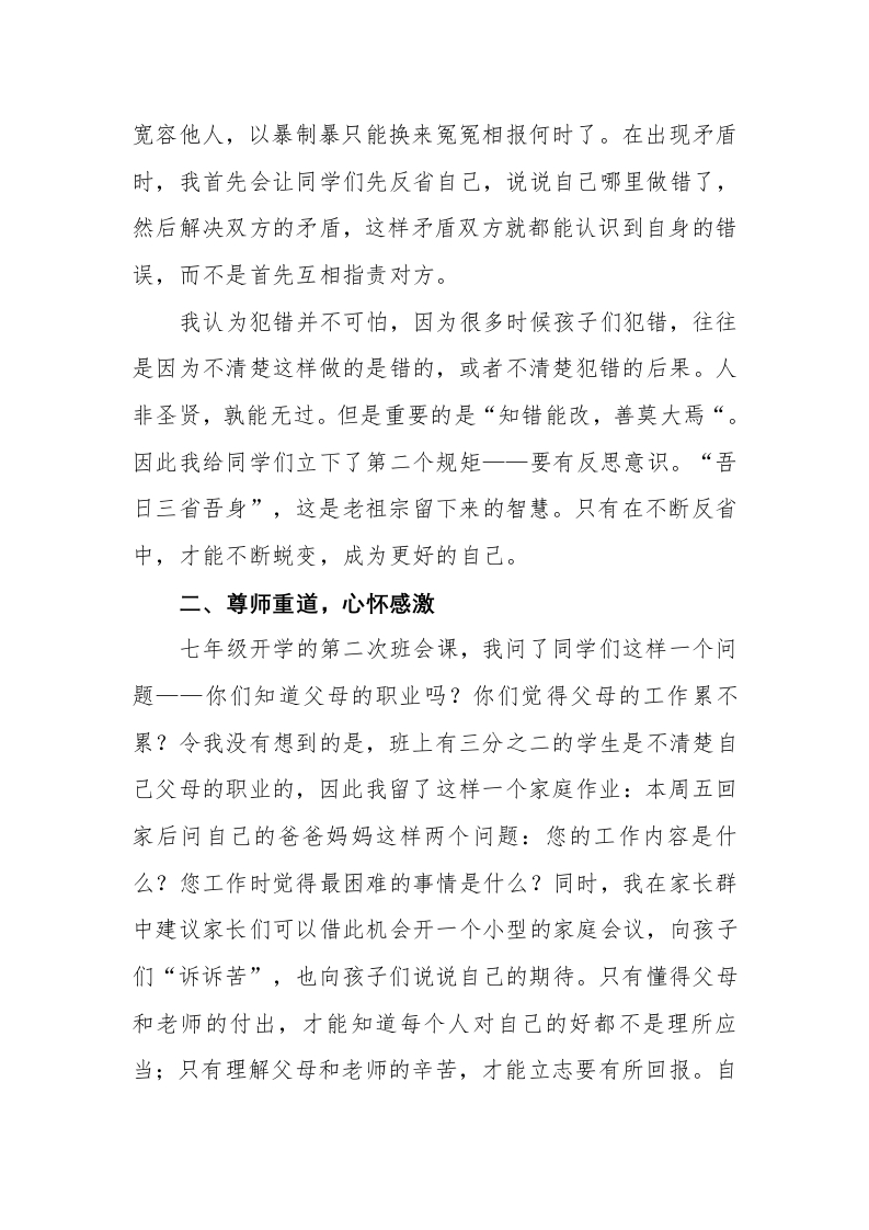 班主任工作经验分享(爱一朵花)晨晨老师6天前发布关注私信0.30MB7页0229 以下为资料部分截图预览,下载后为超高清原文件。 第1页 / 共7页 第2页 / 共7页 试读已结束,还剩5页,您可下载完整版后进行离线阅读 加入VIP,享海量教务资料,无限制免费下载所有材料 班主任工作经验分享(爱一朵花)此内容为付费资源,请付费后查看¥9.9¥15.9VIP会员免费代理(享70%分佣)免费立即购买您当前未登录!建议登陆后购买,可保存购买订单付费资源© 版权声明文章版权归作者所有,未经允许请勿转载。THE END学校活动综合资料 文本预览 2026年初中班主任优秀工作经验分享(爱一朵花最好的方式是陪它盛开)各位领导、各位同仁:大家好!非常荣幸在此交流班主任工作心得。我分享的题目是《爱一朵花最好的方式是陪它盛开》,这既是我的教育理念,也是工作的深刻体会。面对初遇时如“小恶魔”般的孩子,我的工作便是日复一日地用规矩扶正,用感恩滋养,用激励照耀,用合作浇灌,在温暖陪伴中见证成长。现将我陪伴孩子们“盛开”过程中的一些实践与感悟向大家汇报,其中不乏粗浅之处,恳请各位批评指正。一、不成规矩,无以方圆儒家学派的荀子有一个很重要的观点一一“性恶论”,他认为人的自然属性无所谓善恶和好坏,人性有可能转化为恶,也有可能发展为善。因此,要重视道德教育对人的成长的深远影响。世界上没有所谓的坏孩子,只有教育不好孩子的家长和老师。七年级初遇三班孩子们的时候,时时处处要担心,方方面面都操心,孩子们就像一个个“小恶魔”,一会儿在这“点个火”,一会儿在那“上个房”。因此我深刻意识到必须先给孩子们“立规矩”。我给孩子们定下的第一条班训就是一一严于律己,宽以待人。对自己要严格一点,要懂得自律、慎独。同时要学会 查看更多 收起部分 喜欢就支持一下吧点赞9 分享QQ空间微博QQ好友海报分享复制链接收藏