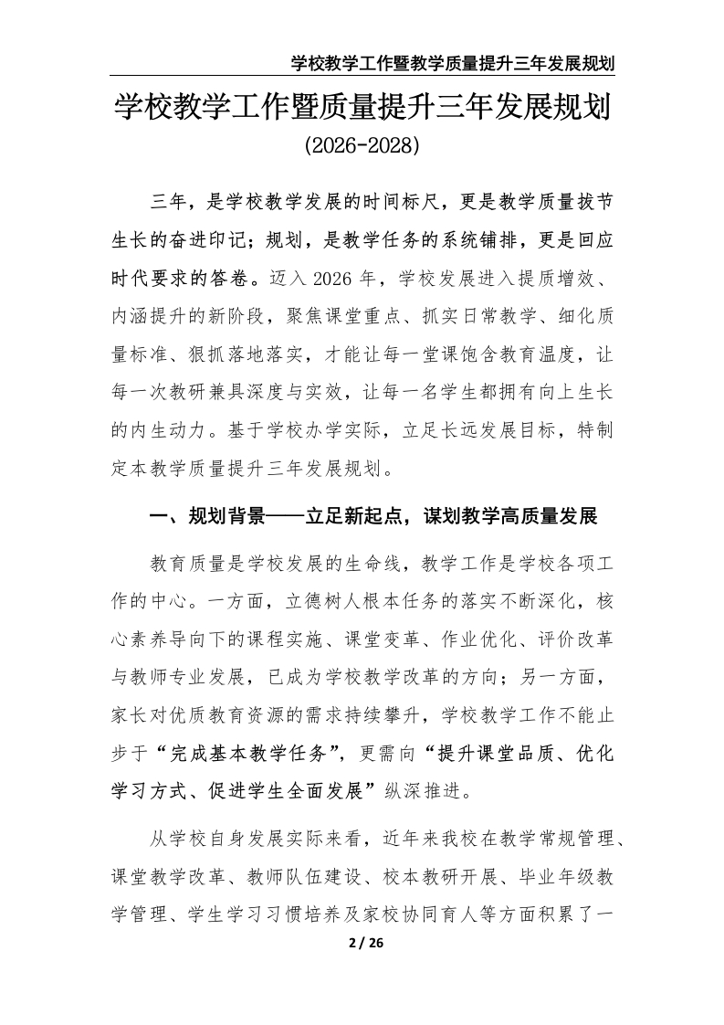 以质立教强根基以学为本向未来——学校教学工作暨质量提升三年发展规划晨晨老师6天前发布关注私信49.18KB26页0495 以下为资料部分截图预览,下载后为超高清原文件。 第1页 / 共26页 第2页 / 共26页 试读已结束,还剩24页,您可下载完整版后进行离线阅读 加入VIP,享海量教务资料,无限制免费下载所有材料 以质立教强根基以学为本向未来——学校教学工作暨质量提升三年发展规划此内容为付费资源,请付费后查看¥9.9¥15.9VIP会员免费代理(享70%分佣)免费立即购买您当前未登录!建议登陆后购买,可保存购买订单付费资源© 版权声明文章版权归作者所有,未经允许请勿转载。THE END学校活动综合资料 文本预览 学校教学工作暨教学质量提升三年发展规划以质立教强根基以学为本向未来学校教学工作暨质量提升三年发展规划(2026-2028)一、规划背景一一立足新起点,谋划教学高质量发展…2二、指导思想一一以高质量教学,托举学生品质成长3三、发展定一一有温度、品质、成长力的教学生态4四、现状分析一一明晰基础与短板,找准提质发力点5五、总体目标一一构建学校教学高质量提升的新生态6六、重点任务一一聚焦六大工程,推进教学质量提升…7(一)实施“制度固本”夯实教学管理根基…7(二)实施“课堂提质”紧抓质量提升重心8(三)实施“课程强基”拓展学生发展路径…10(四)实施“教研赋能”激活教师发展源头…10(五)实施“教师成长”锻造提质增效师资队伍…12(六)实施“学生培优”提升学生学习品质实效…13七、重点行动一一聚焦关键环节,打出提质“组合拳”14八、年度推进一一三年分步实施,教学质量“递进升”15第一阶段:2026年一一打牢教学基础,立好质量标准…15第二阶段:2027年一一推深教学改革,做实教学质量.16第三阶段:2028年一一固化实践经验,彰显教学特色…17九、保障机制一一强化多维支撑,确保规划落地见效…18十、评价机制一一构建评价体系,推动教学持续改进.…19附件1:学校教学质量提升三年规划重点领域推进表…20附件2-4:2026-2028年度教学工作任务分解表…21以质立教强根基以学为本向未来1/26 查看更多 收起部分 喜欢就支持一下吧点赞5 分享QQ空间微博QQ好友海报分享复制链接收藏