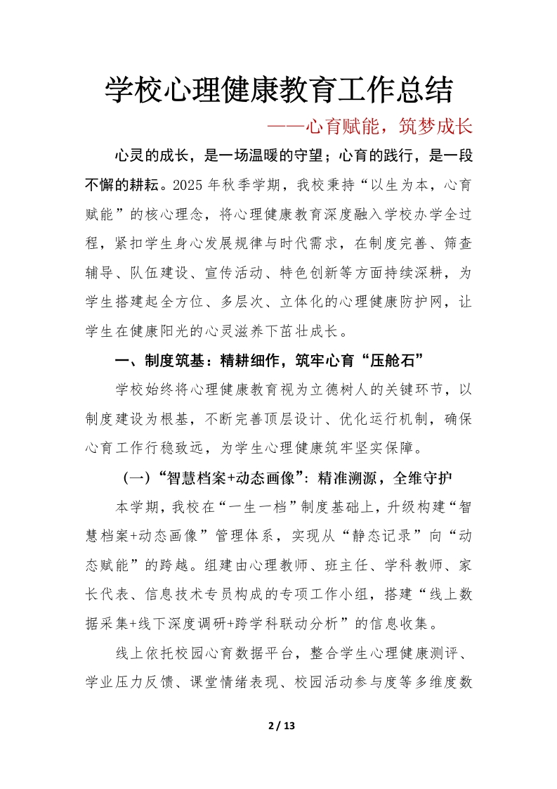 2025年秋季学期学校心理健康教育工作总结晨晨老师6天前发布关注私信26.16KB13页04412 以下为资料部分截图预览,下载后为超高清原文件。 第1页 / 共13页 第2页 / 共13页 试读已结束,还剩11页,您可下载完整版后进行离线阅读 加入VIP,享海量教务资料,无限制免费下载所有材料 2025年秋季学期学校心理健康教育工作总结此内容为付费资源,请付费后查看¥9.9¥15.9VIP会员免费代理(享70%分佣)免费立即购买您当前未登录!建议登陆后购买,可保存购买订单付费资源© 版权声明文章版权归作者所有,未经允许请勿转载。THE END学校活动综合资料 文本预览 2025-2026学年第一学期学校心理健康教育工作总结一一心育赋能,筑梦成长一、制度筑基:精耕细作,筑牢心育“压舱石”(一)“智慧档案+动态画像”:精准溯源,全维守护(二)“五级联动+协同预警”:闭环干预,防患未然(三)“三维空间+文化浸润”:优化生态,滋养心灵二、筛查赋能:多维研判,守护心灵“避风港”(一)分层普查:精准画像,靶向定位(二)多元辅导:分类施策,科学干预三、队伍锻造:精研深耕,培育心育“主力军”(一)融合教研:知行合一,提质增效(二)定制培训:靶向赋能,精进技能(三)关怀赋能:凝心聚力,调适身心四、宣传浸润:多元创新,播撒心育“金种子”(一)融煤体宣传:全域覆盖,深入人心(二)沉浸式启航课:启智润心,蓄力成长(三)分层化活动课:课堂赋能,个性培育五、特色赋能:创新实践,绘就心育“新图景”(一)“心晴市集·情绪交换计划”:以心换心,共赴暖阳(二)“成长手账·心灵印记”:拾光筑梦,感悟蜕变(三)“未来信箱·逐梦同行”:寄望时光,笃定前行(四)“亲子心育工作坊”:家校同心,共护成长2025-2026学年第一学期1/13 查看更多 收起部分 喜欢就支持一下吧点赞12 分享QQ空间微博QQ好友海报分享复制链接收藏