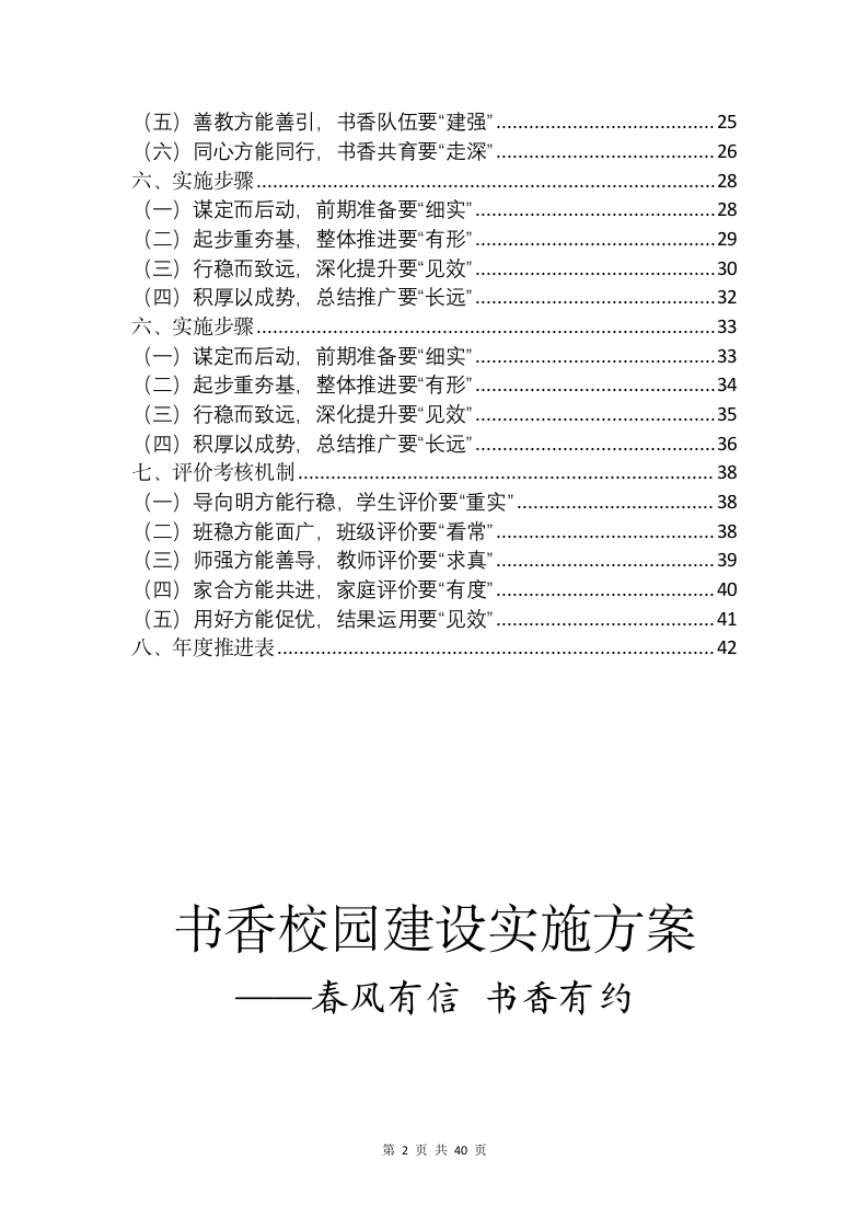 书香校园建设实施方案春风有信书香有约目录一、建设背景与现实基础.….2(一)应势而谋明方向....2(二)因校而定看基础.2(三)循症而察找短板.3(四)顺势而为定重点.3二、指导思想…(一)以文润心强根基..4(二)以读促学提质效.4(三)以建促优塑生态….4三、建设目标.….5(一)锚定育人方向,夯实书香校园之“基”.5(二)聚焦学生成长,凸显书香阅读之“效”.6(三)立足教师发展,厚植书香引领之“能.6(四)建强班级阵地,激发书香班级之“活.7(五)深化家校协同,拓展书香共育之“域.8(六)涵养校园文化,彰显书香浸润之“美”9四、基本原则.10(一)要在“全”上走实,做到“书”而有香.10(二)要在“分”上走细做到“读“而有法.11(三)要在“课”上走深,做到“学"而有根13(四)要在“动”上走活,做到“行”而有趣.14(五)要在“常"上走稳,做到“育"而有恒.15(六)要在“管"上走严,做到“推"而有序…...16五、建设内容.17(一)根深方能叶茂,书香课程要“筑牢.17(二)渠清方能流远,书香资源要“盘活..20(三)潮涌方能帆劲,书香活动要“做实21(四)润物方能无声,书香环境要“浸透”...23第1页共40页