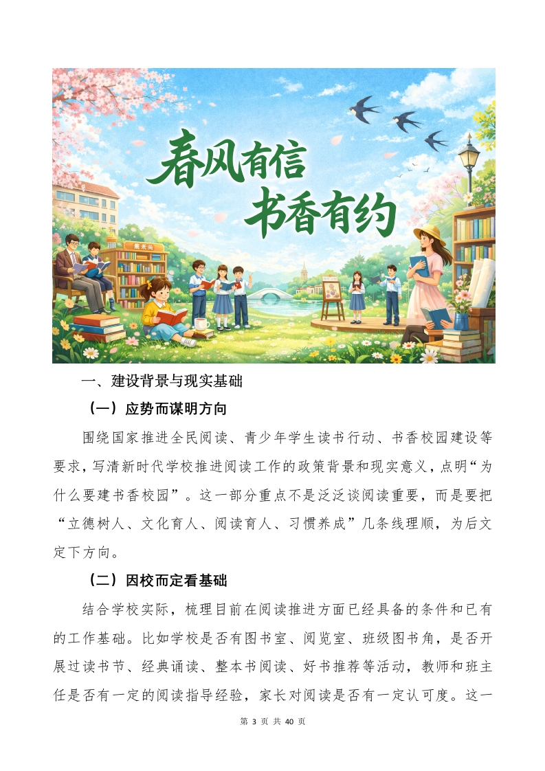 书香校园建设实施方案春风有信书香有约目录一、建设背景与现实基础.….2(一)应势而谋明方向....2(二)因校而定看基础.2(三)循症而察找短板.3(四)顺势而为定重点.3二、指导思想…(一)以文润心强根基..4(二)以读促学提质效.4(三)以建促优塑生态….4三、建设目标.….5(一)锚定育人方向,夯实书香校园之“基”.5(二)聚焦学生成长,凸显书香阅读之“效”.6(三)立足教师发展,厚植书香引领之“能.6(四)建强班级阵地,激发书香班级之“活.7(五)深化家校协同,拓展书香共育之“域.8(六)涵养校园文化,彰显书香浸润之“美”9四、基本原则.10(一)要在“全”上走实,做到“书”而有香.10(二)要在“分”上走细做到“读“而有法.11(三)要在“课”上走深,做到“学"而有根13(四)要在“动”上走活,做到“行”而有趣.14(五)要在“常"上走稳,做到“育"而有恒.15(六)要在“管"上走严,做到“推"而有序…...16五、建设内容.17(一)根深方能叶茂,书香课程要“筑牢.17(二)渠清方能流远,书香资源要“盘活..20(三)潮涌方能帆劲,书香活动要“做实21(四)润物方能无声,书香环境要“浸透”...23第1页共40页