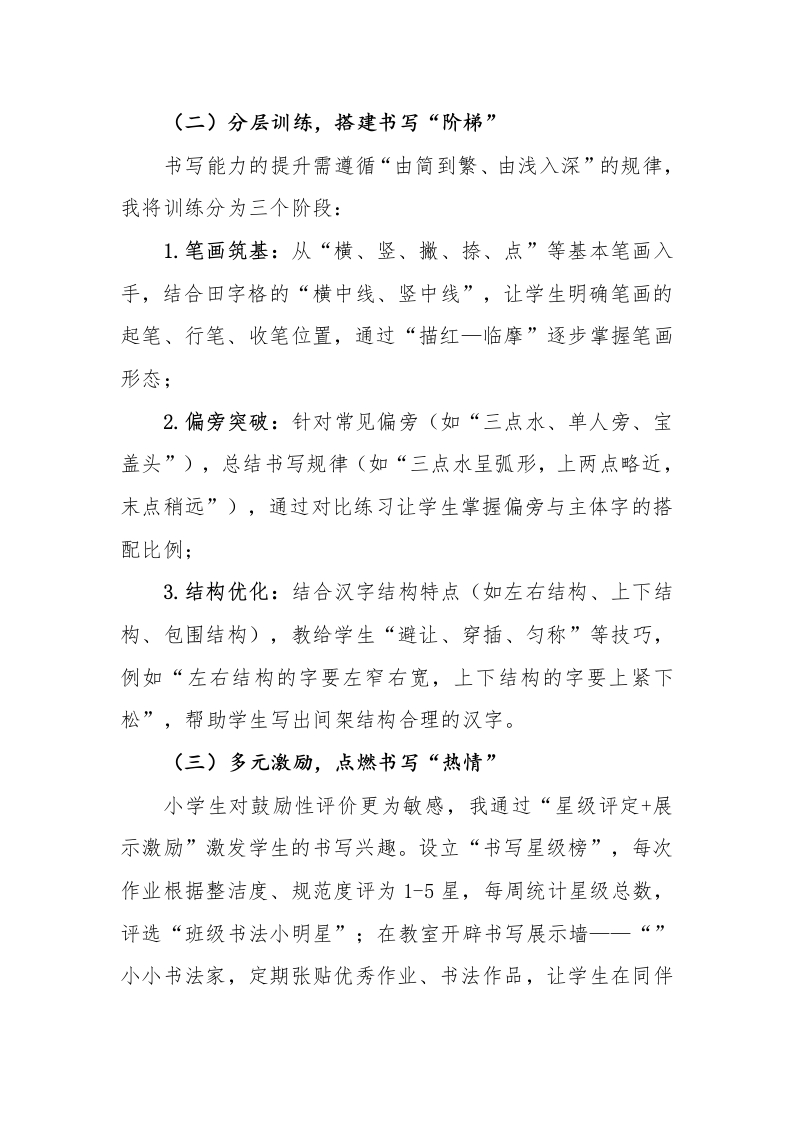 【小学语文】教师经验交流汇报:以“字、书、文”为基,夯实语文素养根基文字稿晨晨老师3天前发布关注私信0.30MB7页0445 以下为资料部分截图预览,下载后为超高清原文件。 第1页 / 共7页 第2页 / 共7页 试读已结束,还剩5页,您可下载完整版后进行离线阅读 加入VIP,享海量教务资料,无限制免费下载所有材料 【小学语文】教师经验交流汇报:以“字、书、文”为基,夯实语文素养根基文字稿此内容为付费资源,请付费后查看¥9.9¥15.9VIP会员免费代理(享70%分佣)免费立即购买您当前未登录!建议登陆后购买,可保存购买订单付费资源© 版权声明文章版权归作者所有,未经允许请勿转载。THE END综合资料 文本预览 2026年小学语文教师工作经验交流汇报(以“字、书、文”为基,夯实语文素养根基)语文是传承文化的载体,是塑造思维的工具,更是学生认识世界、表达自我的基础学科。在小学语文教学中,“写好字、读好书、作好文”是贯穿始终的核心任务,也是提升学生语文核心素养的关键路径。结合多年教学实践,我从以下三方面展开具体探索,向大家作汇报分享。一、以“规”立字:让学生在循序渐进中写好规范字汉字不仅是交流工具,更承载着文化底蕴。小学阶段是书写习惯养成的黄金期,需以“规范”为核心,以“兴趣”为驱动,帮助学生打下坚实的书写基础。(一)先正姿势,筑牢书写“根基”端正的书写姿势是写好字的前提,也是保护学生视力、预防脊柱问题的关键。教学中,我始终强调“三个一”原则:眼离书本一尺远、胸离书桌一拳远、手离笔尖一寸远,并通过“口诀+示范+纠正”三步法强化习惯。例如,使用通俗口诀“头正,肩平,身直,足安”,“老大老二头对头,老三垫在笔下头,老四老五藏里头,手离笔尖一指头”,“一抵二压三衬托,指实掌虚腕灵活”,配合教师正面示范、学生互相检查,再利用课堂巡视及时纠正握笔过紧、身体歪斜等问题,让姿势要求融入日常书写的每一分钟。 查看更多 收起部分 喜欢就支持一下吧点赞5 分享QQ空间微博QQ好友海报分享复制链接收藏